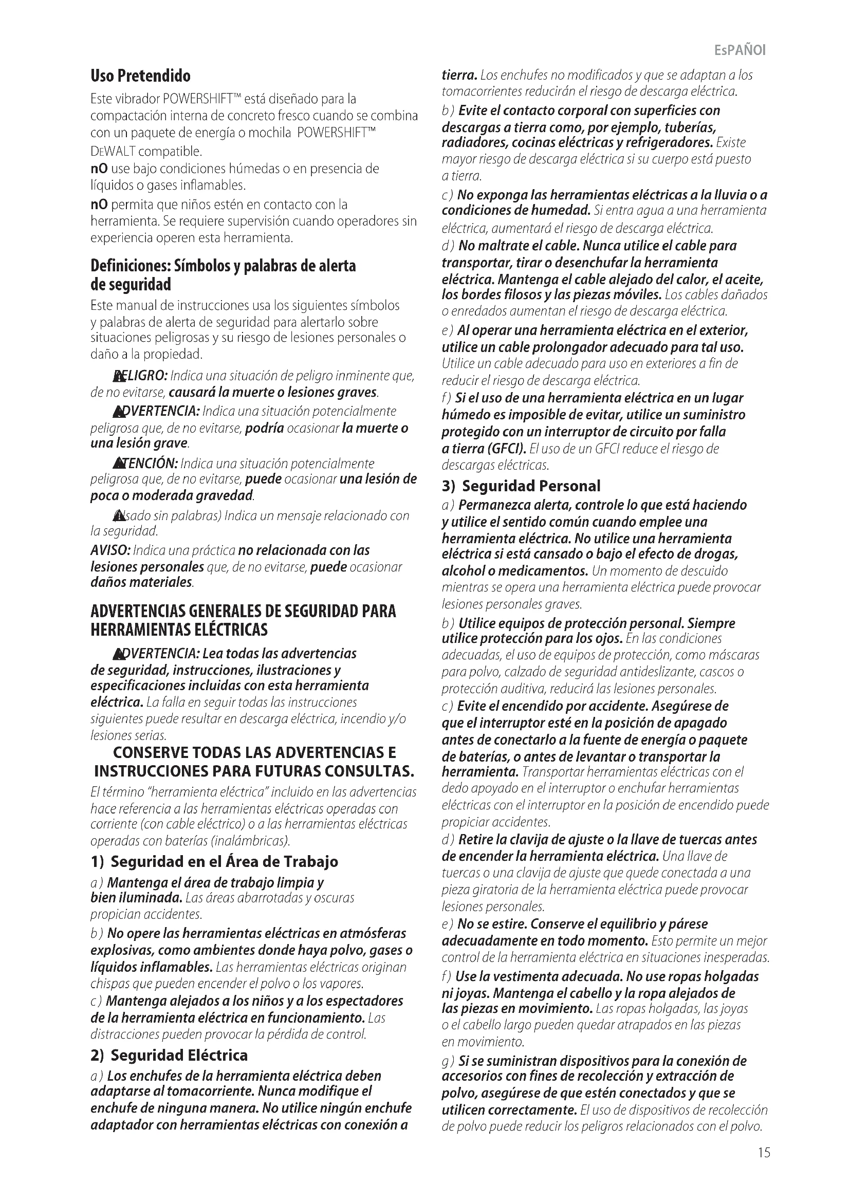 (Usado sin palabras) Indica un mensaje relacionado con laseguridad. AVISO: Indica una práctica no relacionada con las lesiones personales que, de no evitarse, puede ocasionar dañosmateriales. Uso Pretendido Este vibrador POWERSHIFT™ está diseñado para la compactación interna de concreto fresco cuando se combina con un paquete de energía o mochila POWERSHIFT™ DeWALT compatible. nO use bajo condiciones húmedas o en presencia de líquidos o gases inflamables. nO permita que niños estén en contacto con la herramienta. Se requiere supervisión cuando operadores sin experiencia operen esta herramienta. Español (traducido de las instrucciones originales)EsPAñOl