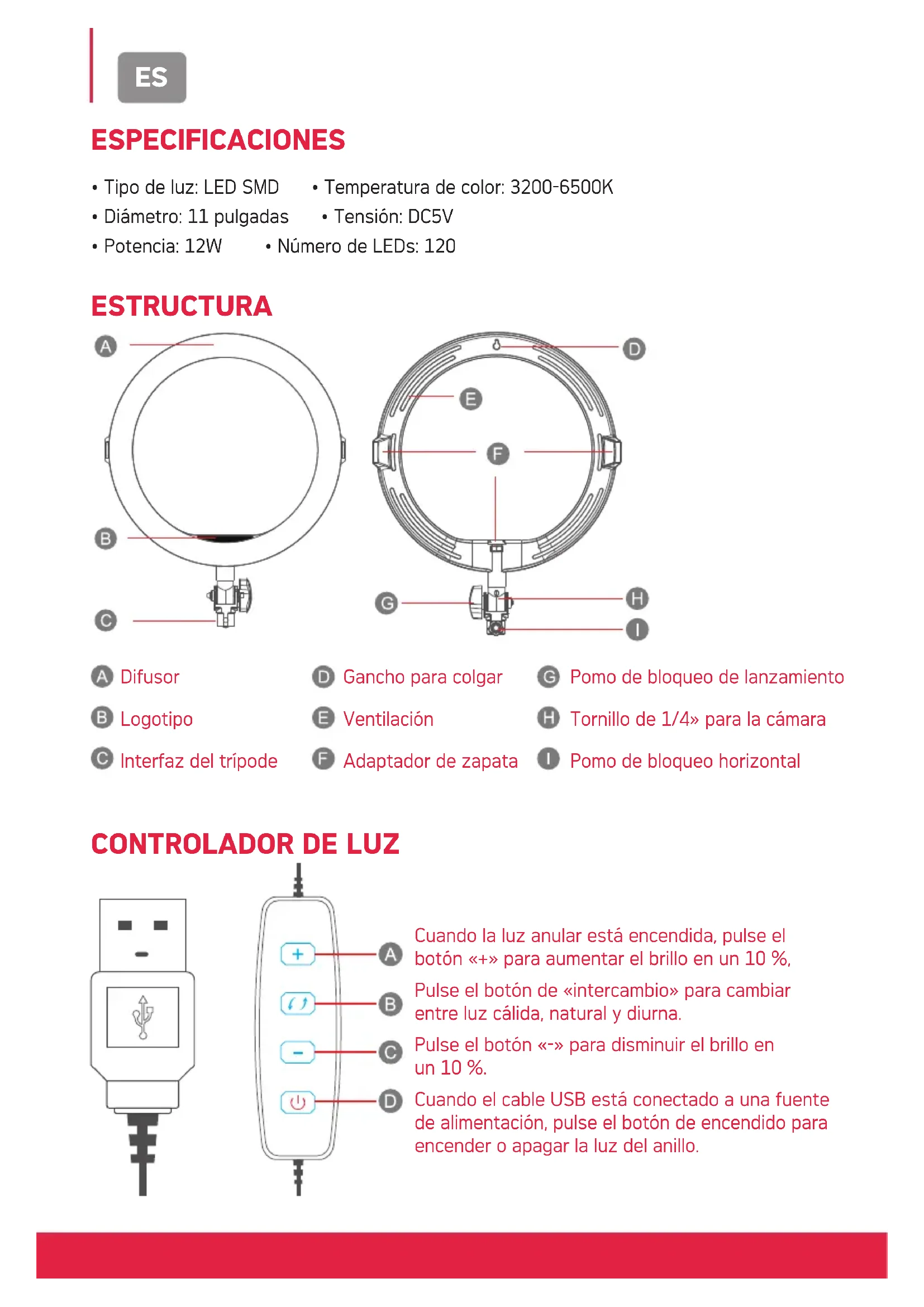 Cuando la luz anular está encendida, pulse el botón «+» para aumentar el brillo en un 10 %, Pulse el botón de «intercambio» para cambiar entre luz cálida, natural y diurna. Pulse el botón «-» para disminuir el brillo en un 10 %. Cuando el cable USB está conectado a una fuente de alimentación, pulse el botón de encendido para encender o apagar la luz del anillo. Difusor Logotipo Interfaz del trípode Pomo de bloqueo de lanzamiento Tornillo de 1/4» para la cámara Pomo de bloqueo horizontal Gancho para colgar Ventilación Adaptador de zapataES ESPECIFICACIONES
