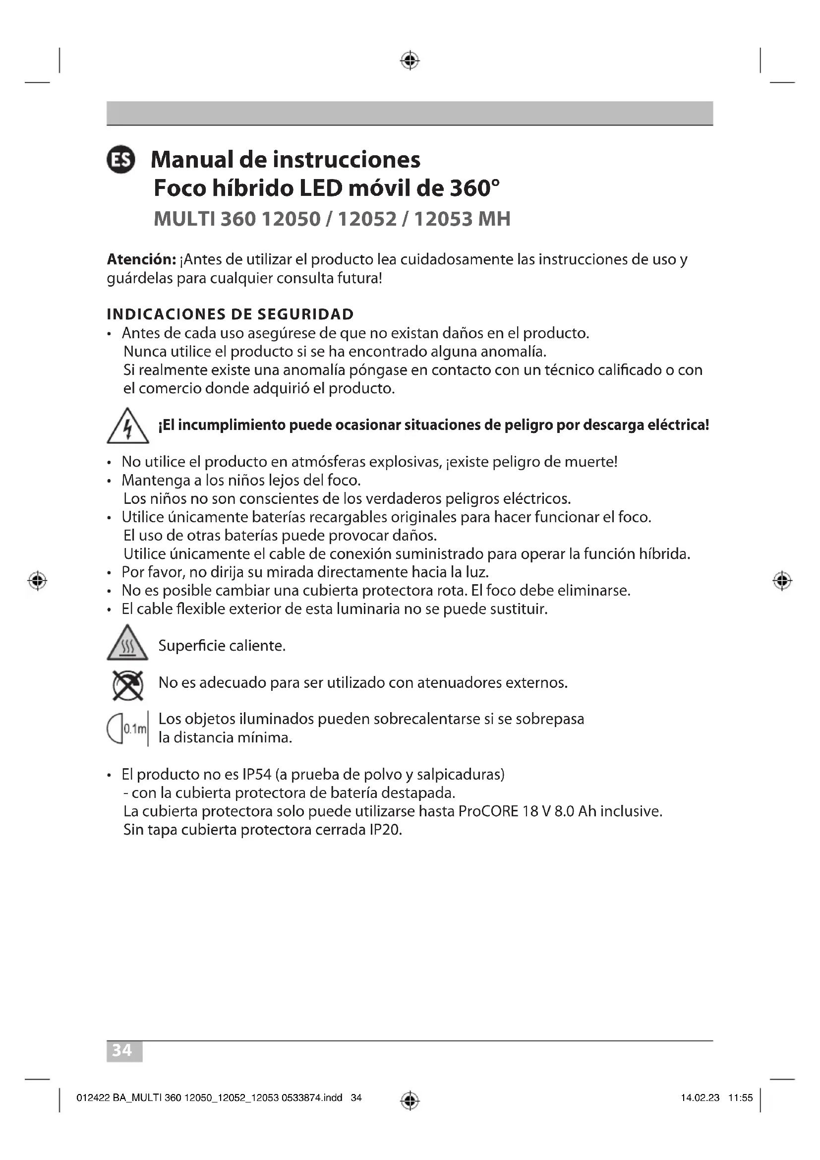 - El producto no es IP54 (a prueba de polvo y salpicaduras) - con la cubierta protectora de batería destapada. La cubierta protectora solo puede utilizarse hasta ProCORE 18 V 8.0 Ah inclusive. Sin tapa cubierta protectora cerrada IP20. 012422 BA_MULTI 360 12050_12052_12053 0533874.indd 34012422 BA_MULTI 360 12050_12052_12053 0533874.indd 34 14.02.23 11:5514.02.23 11:5535 MULTI 360 12050 / 12052 / 12053 MH Manual de instrucciones