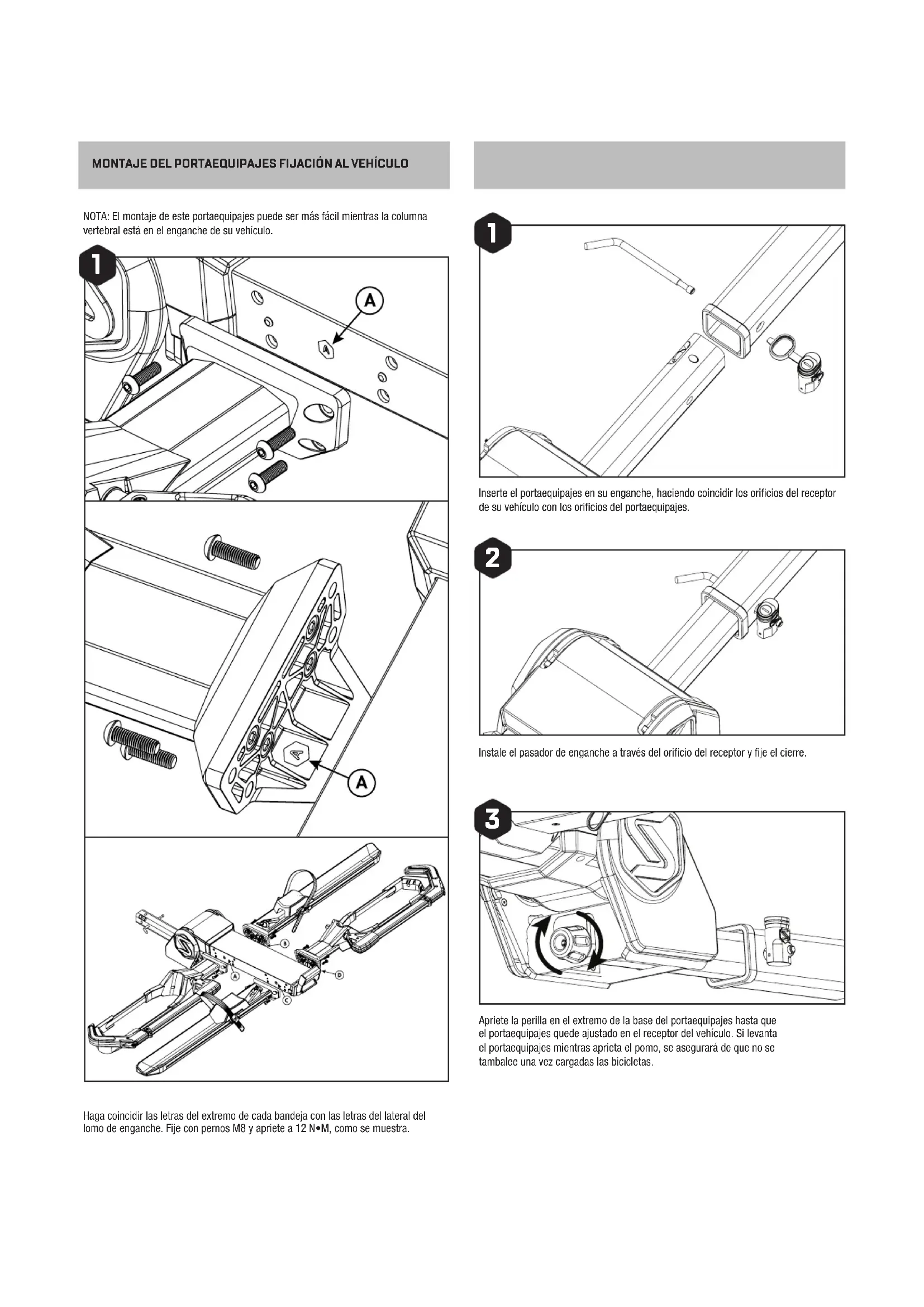 JMONTAJE DEL PORTAEQUIPAJES FIJACIÓN AL VEHÍCULO Inserte el portaequipajes en su enganche, haciendo coincidir los oricios del receptor de su vehículo con los oricios del portaequipajes. Instale el pasador de enganche a través del oricio del receptor y je el cierre. Apriete la perilla en el extremo de la base del portaequipajes hasta que el portaequipajes quede ajustado en el receptor del vehículo. Si levanta el portaequipajes mientras aprieta el pomo, se asegurará de que no se tambalee una vez cargadas las bicicletas. Haga coincidir las letras del extremo de cada bandeja con las letras del lateral del lomo de enganche. Fije con pernos M8 y apriete a 12 N•M, como se muestra. NOTA: El montaje de este portaequipajes puede ser más fácil mientras la columna vertebral está en el enganche de su vehículo.