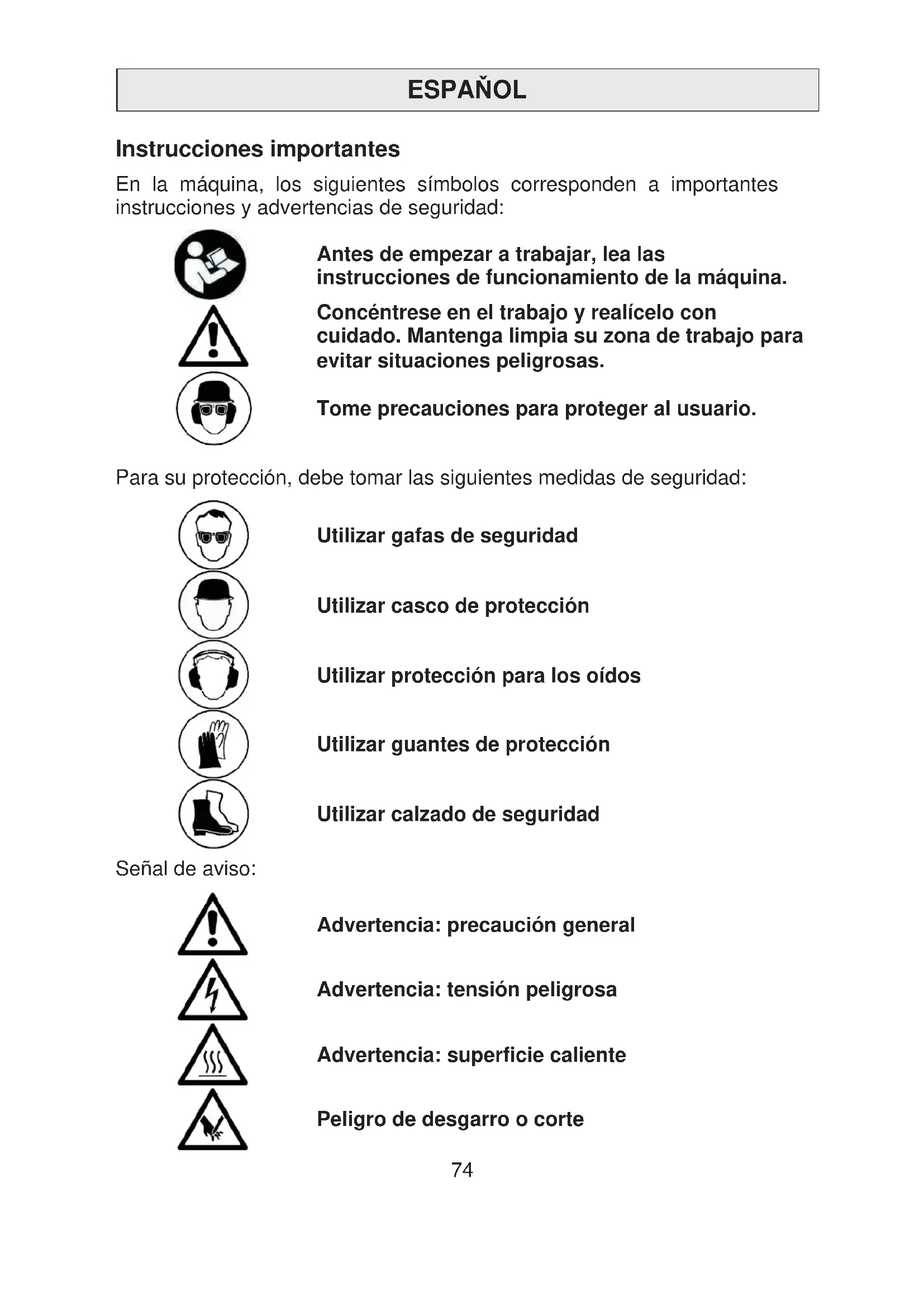 ESPAOL Instrucciones importantes En la máquina, los siguientes símbolos corresponden a importantes instrucciones y advertencias de seguridad: