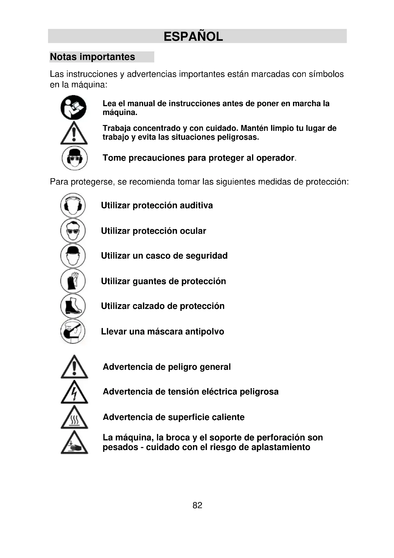 Si el cable de conexión se daña o se corta durante el tra- bajo, no lo toque, desenchúfelo inmediatamente. No utilice nunca el aparato con un cable de conexión dañado. Antes de taladrar en techos y paredes, compruebe la Sitio de perforación para electricidad oculta, gas y Tuberías de agua u otros medios. Compruebe la zona de trabajo, por ejemplo, con un Detector de metales. Consulte al ingeniero estructural responsable antes de em- pezar su trabajo para determinar la posición exacta del agujero. Asegurar la zona al perforar techos desde abajo, ya que el núcleo de perforación puede caerse por la parte inferior. Mantenga las herramientas eléctricas alejadas de la llu- via o la humedad. La entrada de agua en una herramienta eléctrica aumenta el riesgo de descarga eléctrica. No trabajar en atmósferas potencialmente explosivas. No trabaje en escaleras. No deben procesarse materiales que contengan amianto. No transporte nunca el aparato por el cable y compruebe el aparato, el cable y el enchufe antes de cada uso. Encargue la reparación de los daños únicamente a un especialista. In- serte el enchufe en la toma sólo cuando la máquina esté apagada. No está permitida la manipulación del dispositivo. Extraiga el enchufe de la red y compruebe que el interruptor está des- conectado si el taladro sacanúcleos se deja sin vigilancia, por ejemplo, durante los trabajos de montaje y desmontaje, en caso de corte de cor- riente, al insertar o instalar un accesorio.85 Apague la máquina si se para por cualquier motivo. Esto evitará que la máquina se ponga en marcha repentinamente cuando esté desa- tendida. No utilice el aparato si alguna pieza de la carcasa está defectuosa o si el interruptor, el cable de alimentación o el enchufe están dañados. Cuando trabaje, guíe siempre el cable de alimentación, el cable alarga- dor y la manguera de aspiración hacia atrás, alejándolos del aparato. Las herramientas eléctricas deben ser inspeccionadas visualmente por un especialista a intervalos regulares. Después de interrumpir su trabajo, encienda el taladro sacanúcleos sólo cuando se haya asegurado de que la broca puede girar li- bremente. El aparato sólo puede utilizarse con las dos manos o sobre un soporte de taladro. Mantenga los mangos secos, limpios y sin aceite ni grasa. No introduzca las manos en las piezas giratorias. Los menores de 16 años no deben utilizar el aparato. El usuario y las personas que se encuentren cerca deben llevar gafas de seguridad adecuadas, casco, protección auditiva, máscara anti- polvo, guantes de protección y calzado de seguridad cuando utilicen el aparato.