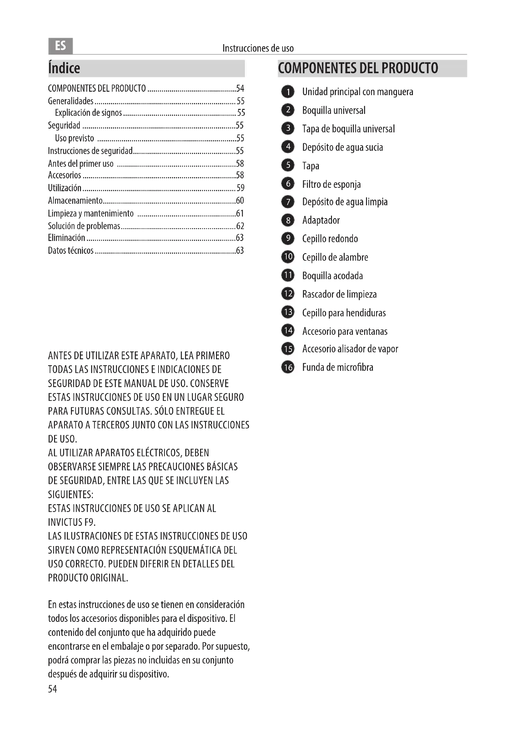 Si tiene alguna pregunta sobre el dispositivo o piezas de recambio/accesorios, póngase en contacto con su distribuidor local. Eliminación (Aplicable en la Unión Europea y otros países europeos con sistemas de recogida selectiva de materiales reciclables) Los aparatos viejos no deben tirarse con la basura doméstica. Si el aparato ya no se puede utilizar, los consumidores tienen la obligación legal de eliminar los aparatos viejos por separado de la basura doméstica, por ejemplo, en un punto de recogida de su municipio/ barrio. Esto garantiza que los aparatos viejos se reciclen correctamente y se eviten los efectos negativos sobre el medio ambiente. Por este motivo, los aparatos eléctricos están etiquetados con el símbolo que se muestra aquí. Deshaciéndose de su aparato correctamente, usted también puede ayudar a proteger el medio ambiente y la salud de los demás. El reciclado de materiales ayuda a reducir el consumo de materias primas. Para obtener más información sobre la eliminación y el reciclaje de este aparato, póngase en contacto con el servicio local de eliminación de residuos, la tienda donde adquirió el producto o el fabricante. Datos técnicos Dispositivo INVICTUS F9 Modelo INVSC-F9 Dimensiones 350 x 325 x 225 mm Alimentación 220-240V Potencia 2000 W Capacidad del depósito de agua limpia 1600 ml Capacidad del depósito de agua sucia 1300 ml Funda de microbra: 100% Algodón