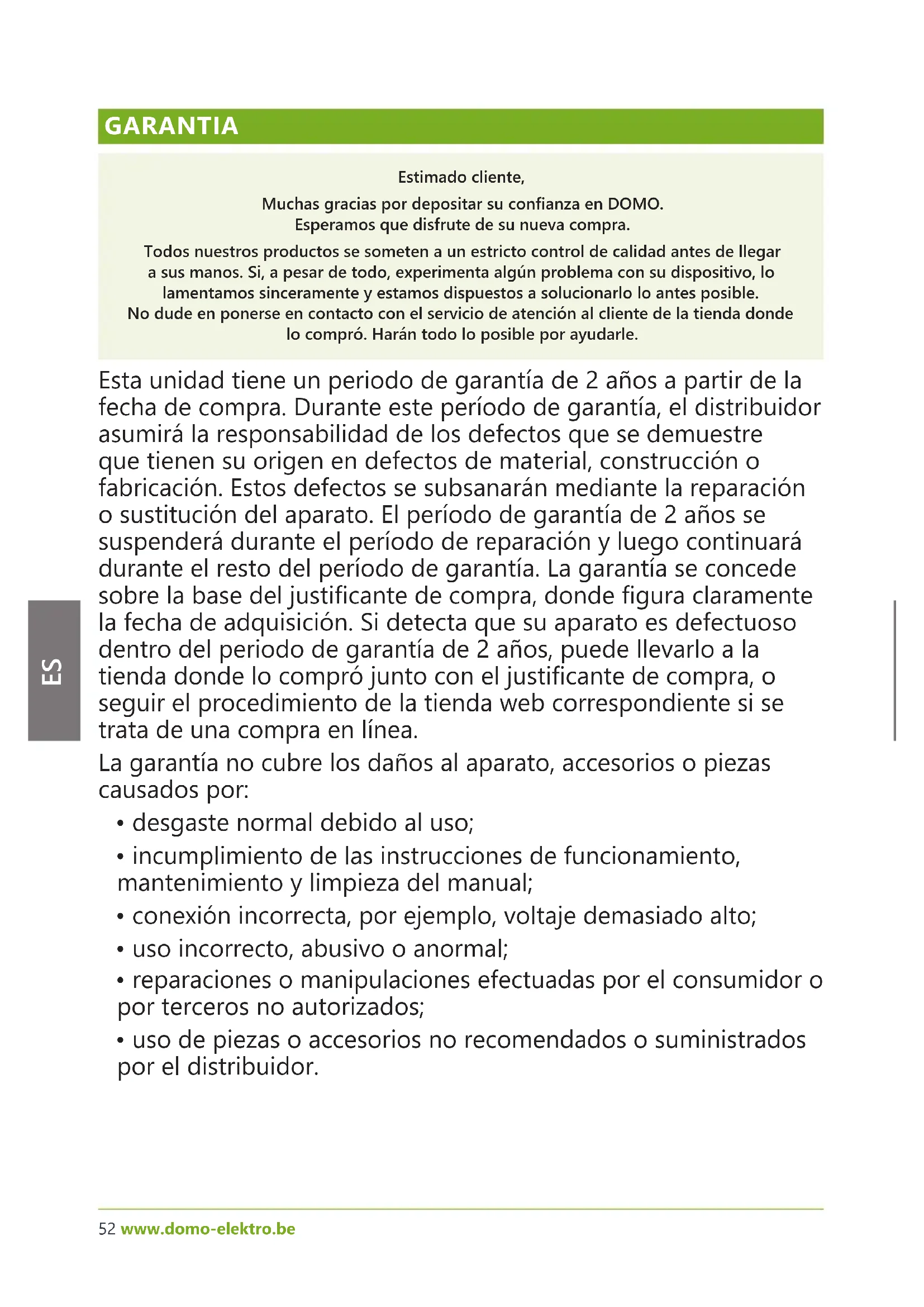 GARANTIA Estimado cliente, Muchas gracias por depositar su conanza en DOMO. Esperamos que disfrute de su nueva compra. Todos nuestros productos se someten a un estricto control de calidad antes de llegar a sus manos. Si, a pesar de todo, experimenta algún problema con su dispositivo, lo lamentamos sinceramente y estamos dispuestos a solucionarlo lo antes posible. No dude en ponerse en contacto con el servicio de atención al cliente de la tienda donde lo compró. Harán todo lo posible por ayudarle. Esta unidad tiene un periodo de garantía de 2 años a partir de la fecha de compra. Durante este período de garantía, el distribuidor asumirá la responsabilidad de los defectos que se demuestre que tienen su origen en defectos de material, construcción o fabricación. Estos defectos se subsanarán mediante la reparación o sustitución del aparato. El período de garantía de 2 años se suspenderá durante el período de reparación y luego continuará durante el resto del período de garantía. La garantía se concede sobre la base del justicante de compra, donde gura claramente la fecha de adquisición. Si detecta que su aparato es defectuoso dentro del periodo de garantía de 2 años, puede llevarlo a la tienda donde lo compró junto con el justicante de compra, o seguir el procedimiento de la tienda web correspondiente si se trata de una compra en línea. La garantía no cubre los daños al aparato, accesorios o piezas causados por: