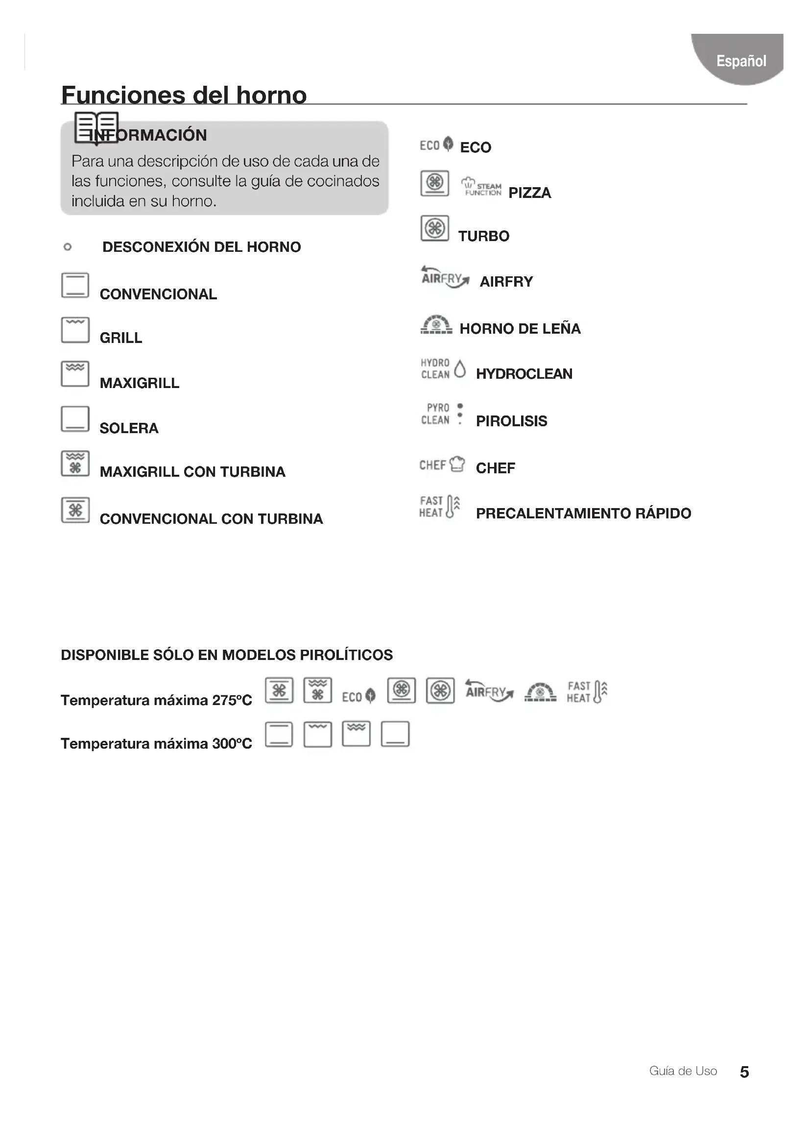 re- quiere de una limpieza con más profundi- dad, utilice detergentes neutros y esponjas no abrasivas.15 Guía de Uso Español ATENCIÓN Retire del interior cualquier derrame o resto excesivo de suciedad, ya que durante la pi- rolisis podrían inflamarsee corriendo peligro de incendio. ATENCIÓN Antes de poner en marcha la pirólisis, ase- gúrese de que la puerta del horno está co- rrectamente cerrada.