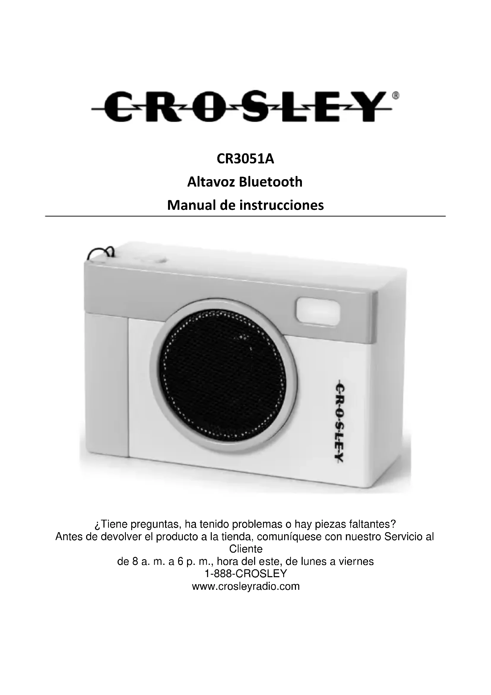 Nota: El Beneficiario no es responsable de cualquier cambio o modificación que no tenga la aprobación expresa de la parte responsable del cumplimiento. Estas modificaciones podrían anular la autoridad del usuario para operar el equipo. El dispositivo ha sido evaluado para cumplir con el requisito general de exposición a RF. Para mantener el cumplimiento de las pautas de exposición a RF de la FCC, la distancia debe ser de al menos 20 cm entre el radiador y su cuerpo, y debe estar totalmente soportada por las configuraciones de instalación y operación del transmisor y su(s) antena(s). DECLARACIÓN DE CONFORMIDAD SIMPLIFICADA DE EU Por la presente, Modern Marketing Concepts Inc., que opera bajo la denominación comercial de Crosley Brands, declara que el tipo de equipo de radio cumple con la Directiva 2014/53/UE. El texto completo de la declaración de conformidad de la UE está disponible en la siguiente dirección de Internet: http://crosleybrands.com/euDoCCR3051A Haut-parleur Bluetooth Manuel d’utilisation