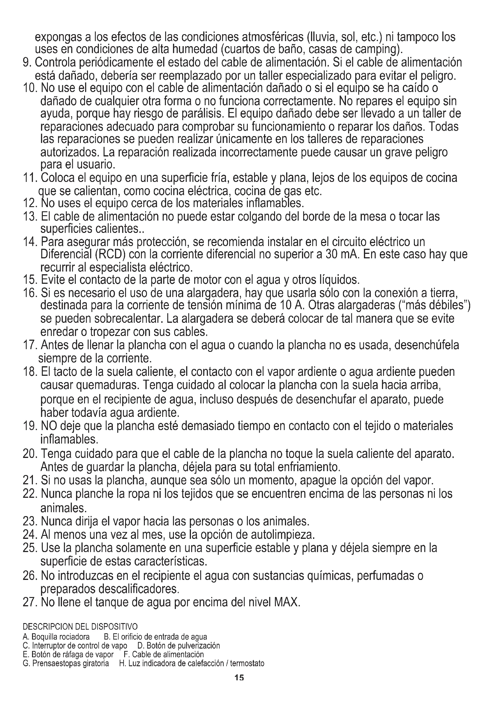 17. Antes de llenar la plancha con el agua o cuando la plancha no es usada, desenchúfela