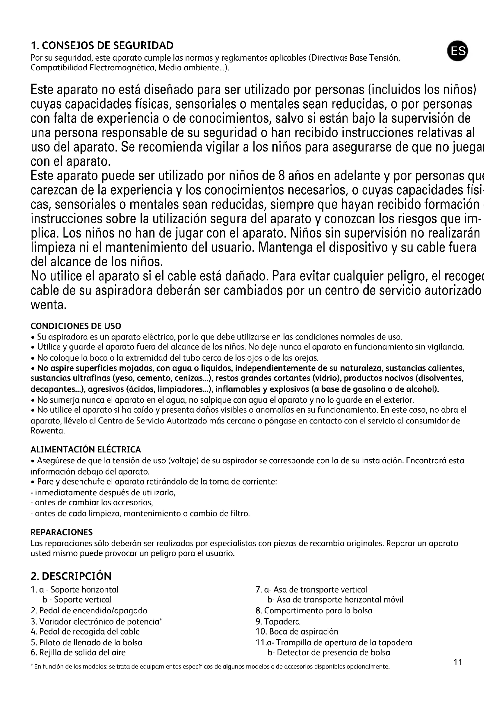 Por su seguridad, este aparato cumple las normas y reglamentos aplicables (Directivas Base Tensión, Compatibilidad Electromagnética, Medio ambiente...). Este aparato no está diseñado para ser utilizado por personas (incluidos los niños) cuyas capacidades físicas, sensoriales o mentales sean reducidas, o por personas con falta de experiencia o de conocimientos, salvo si están bajo la supervisión de una persona responsable de su seguridad o han recibido instrucciones relativas al uso del aparato. Se recomienda vigilar a los niños para asegurarse de que no juegan con el aparato. Este aparato puede ser utilizado por niños de 8 años en adelante y por personas que carezcan de la experiencia y los conocimientos necesarios, o cuyas capacidades físi- cas, sensoriales o mentales sean reducidas, siempre que hayan recibido formación o instrucciones sobre la utilización segura del aparato y conozcan los riesgos que im- plica. Los niños no han de jugar con el aparato. Niños sin supervisión no realizarán la limpieza ni el mantenimiento del usuario. Mantenga el dispositivo y su cable fuera del alcance de los niños. No utilice el aparato si el cable está dañado. Para evitar cualquier peligro, el recogedor y el cable de su aspiradora deberán ser cambiados por un centro de servicio autorizado Ro- wenta.