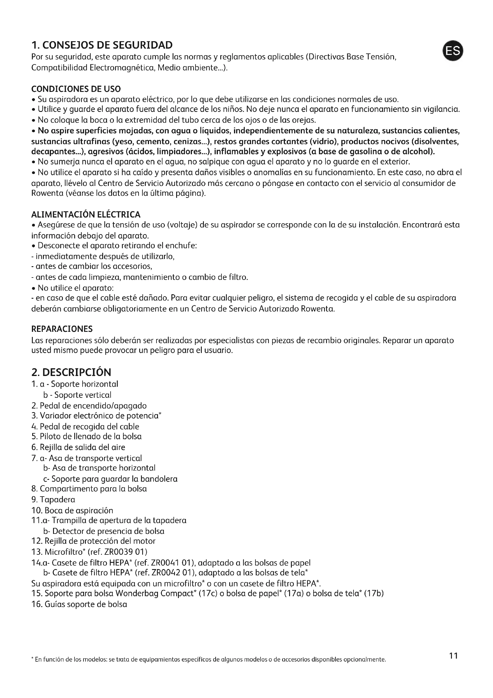 - En caso de dificultad para conseguir los accesorios y los filtros para esta aspiradora, póngase en contacto con el servi- cio al consumidor Rowenta (véanse los datos en la última página).