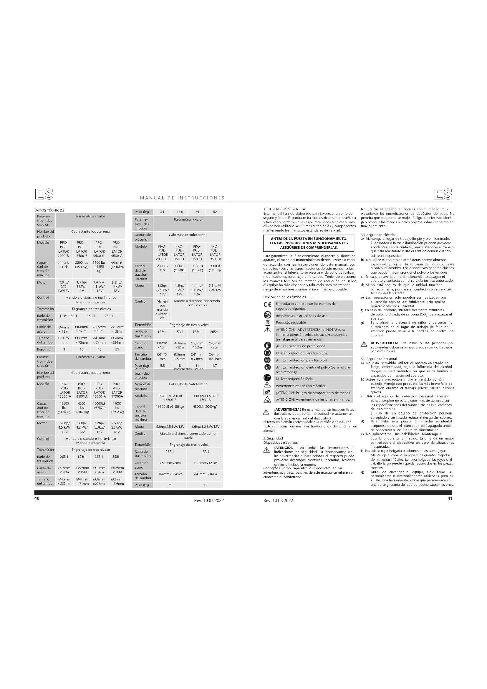Este manual ha sido elaborado para favorecer un empleo seguro y able. El producto ha sido estrictamente diseñado y fabricado conforme a las especicaciones técnicas y para ello se han utilizado las últimas tecnologías y componentes, manteniendo los más altos estándares de calidad. Paráme- tros - des- cripción Parámetros - valor Nombre del producto Cabrestante todoterreno Modelo PROPULLATOR 13500-B PROPULLATOR 4500-B Capaci- dad de tracción máxima 13500LB (6136kg) 4500LB (2040kg) Motor 6.0hp/4,5 kW/12V 1,6hp/1,2 kW/12V Control Mando a distancia conectado con un cable Transmisión Engranaje de tres niveles Ratio de trasmisión 265:1 153:1 Cable de acero Ø9.5mm×28m Ø5.5mm×12.5m Tamaño del tambor Ø64mm×224mm Ø41mm×71mm Peso (kg) 39 12 Paráme- tros – des- cripción Parámetros - valor Nombre del producto Cabrestante todoterreno Modelo PRO- PUL- LATOR 13500-A PRO- PUL- LATOR 4500-A PRO- PUL- LATOR 15000-A PRO- PUL- LATOR 17000A Capaci- dad de tracción máxima