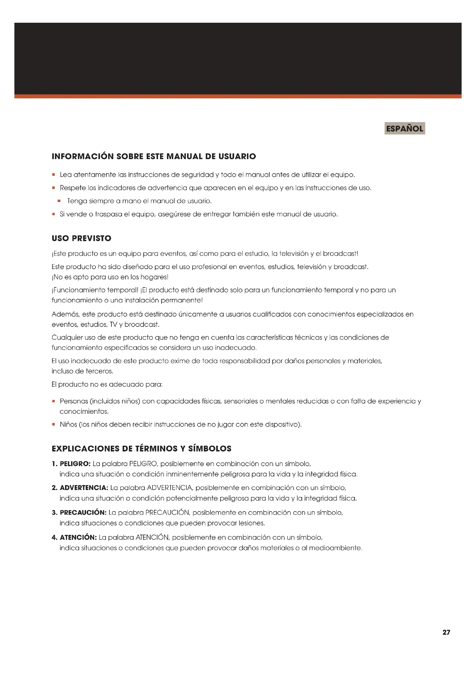 ESPAÑOL 27 INFORMACIÓN SOBRE ESTE MANUAL DE USUARIO 27 USO PREVISTO 27 EXPLICACIONES DE TÉRMINOS Y SÍMBOLOS 27