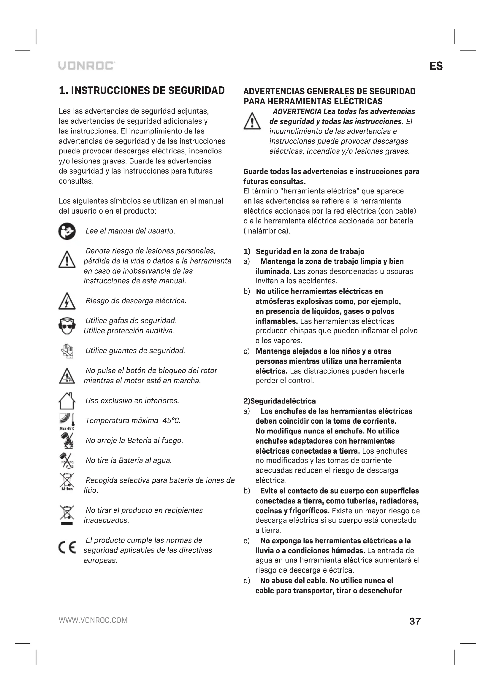 BATERÍA a) No abra la Batería. Peligro de cortocircuito. b) Proteja la Batería del calor, por ejemplo, de la luz solar intensa y continua, del fuego, del agua y de la humedad. Peligro de explosión. c) En caso de daños y uso inadecuado de la Batería, pueden desprenderse vapores. Ventile la zona y solicite asistencia médica en caso de molestias. Los vapores pueden irritar las vías respiratorias. d) Utilice la Batería sólo en combinación con su producto VONROC. Sólo esta medida protege la batería contra sobrecargas peligrosas.