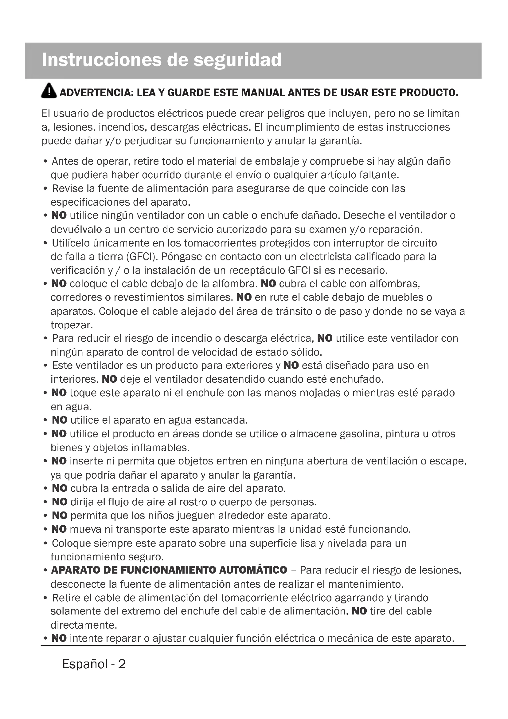 - Este ventilador es un producto para exteriores y NO está diseñado para uso en interiores. NO deje el ventilador desatendido cuando esté enchufado.
