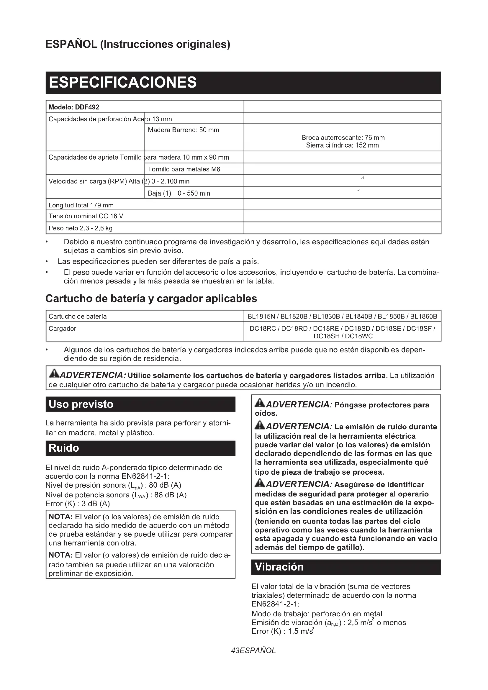 - Algunosdeloscartuchosdebateríaycargadoresindicadosarribapuedequenoesténdisponiblesdepen- diendo de su región de residencia. ADVERTENCIA: Utilice solamente los cartuchos de batería y cargadores listados arriba. La utilización decualquierotrocartuchodebateríaycargadorpuedeocasionarheridasy/ounincendio. Uso previsto Laherramientahasidoprevistaparaperforaryatorni- llarenmadera,metalyplástico. Ruido El nivel de ruido A-ponderado típico determinado de acuerdo con la norma EN62841-2-1: Nivel de presión sonora (L