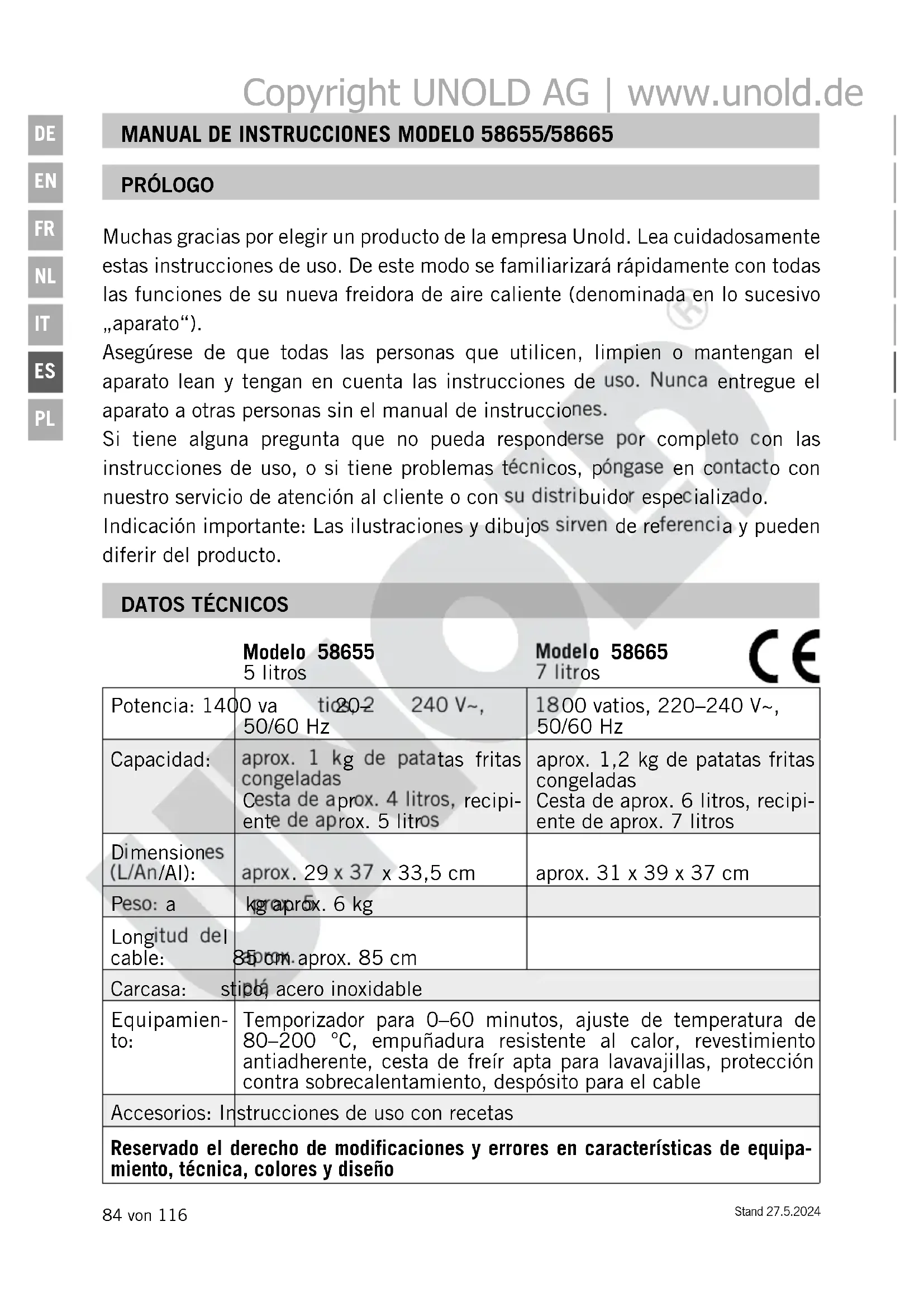Modelo 58655 5 litros Modelo 58665 7 litros Potencia: 1400 vatios, 220–240 V~, 50/60 Hz 1800 vatios, 220–240 V~, 50/60 Hz Capacidad: aprox. 1 kg de patatas fritas congeladas Cesta de aprox. 4 litros, recipi- ente de aprox. 5 litros aprox. 1,2 kg de patatas fritas congeladas Cesta de aprox. 6 litros, recipi- ente de aprox. 7 litros Dimensiones (L/An/Al): aprox. 29 x 37 x 33,5 cm aprox. 31 x 39 x 37 cm Peso: aprox. 5 kg aprox. 6 kg Longitud del cable: aprox. 85 cm aprox. 85 cm Carcasa: plástico, acero inoxidable Equipamien- to: Temporizador para 0–60 minutos, ajuste de temperatura de 80–200 °C, empuñadura resistente al calor, revestimiento antiadherente, cesta de freír apta para lavavajillas, protección contra sobrecalentamiento, despósito para el cable Accesorios: Instrucciones de uso con recetas Reservado el derecho de modificaciones y errores en características de equipa- miento, técnica, colores y diseño Copyright UNOLD AG | www.unold.deStand 27.5.2024 85 von 116