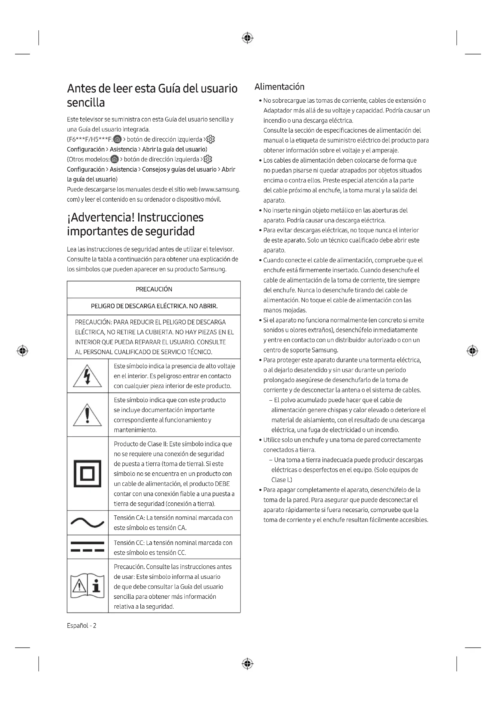 - Para apagar completamente el aparato, desenchúfelo de la toma de la pared. Para asegurar que puede desconectar el aparato rápidamente si fuera necesario, compruebe que la toma de corriente y el enchufe resultan fácilmente accesibles. Antes de leer esta Guía del usuario sencilla Este televisor se suministra con esta Guía del usuario sencilla y una Guía del usuario integrada. (F6***F/H5***F: > botón de dirección izquierda > Configuración > Asistencia > Abrir la guía del usuario) (Otros modelos: > botón de dirección izquierda > Configuración > Asistencia > Consejos y guías del usuario > Abrir la guía del usuario) Puede descargarse los manuales desde el sitio web (www.samsung. com) y leer el contenido en su ordenador o dispositivo móvil. ¡Advertencia! Instrucciones importantes de seguridad Lea las instrucciones de seguridad antes de utilizar el televisor. Consulte la tabla a continuación para obtener una explicación de los símbolos que pueden aparecer en su producto Samsung. PRECAUCIÓN PELIGRO DE DESCARGA ELÉCTRICA. NO ABRIR. PRECAUCIÓN: PARA REDUCIR EL PELIGRO DE DESCARGA ELÉCTRICA, NO RETIRE LA CUBIERTA. NO HAY PIEZAS EN EL INTERIOR QUE PUEDA REPARAR EL USUARIO. CONSULTE AL PERSONAL CUALIFICADO DE SERVICIO TÉCNICO. Este símbolo indica la presencia de alto voltaje en el interior. Es peligroso entrar en contacto con cualquier pieza interior de este producto. Este símbolo indica que con este producto se incluye documentación importante correspondiente al funcionamiento y mantenimiento. Producto de Clase II: Este símbolo indica que no se requiere una conexión de seguridad de puesta a tierra (toma de tierra). Si este símbolo no se encuentra en un producto con un cable de alimentación, el producto DEBE contar con una conexión fiable a una puesta a tierra de seguridad (conexión a tierra). Tensión CA: La tensión nominal marcada con este símbolo es tensión CA. Tensión CC: La tensión nominal marcada con este símbolo es tensión CC. Precaución. Consulte las instrucciones antes de usar: Este símbolo informa al usuario de que debe consultar la Guía del usuario sencilla para obtener más información relativa a la seguridad. Español Español - 2Instalación