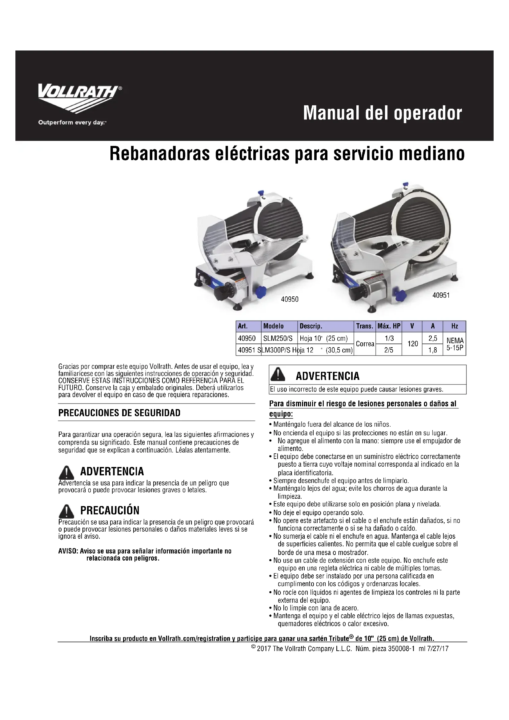 2,5 NEMA 5-15P 40951 SLM300P/S Hoja 12 " (30,5 cm) 2/5 1,8 ADVERTENCIA PRECAUCIÓN ADVERTENCIA El uso incorrecto de este equipo puede causar lesiones graves.2 Rebanadoras eléctricas para servicio mediano Manual del operador