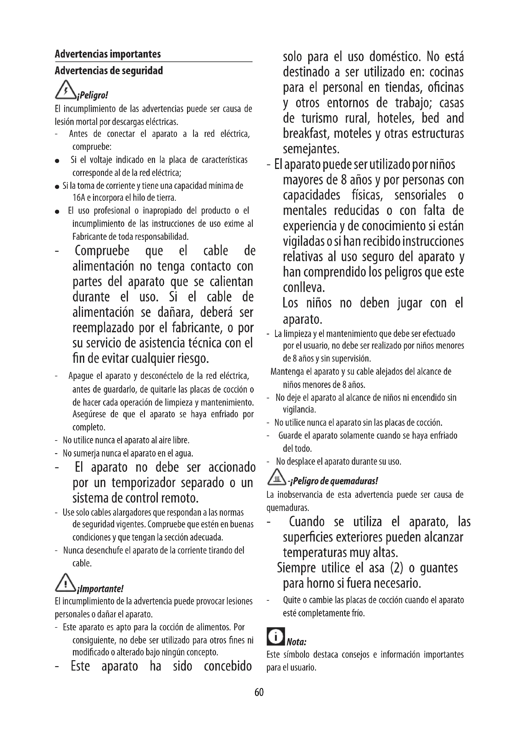 DOSES POUR: 8-10 gaufres PRÉPARATION: 10 minutes TEMPS DE CUISSON: 15 minutes INGRÉDIENTS: - 2 tasses/460g de farine - 1 cuillère à café de sel - 1 cuillère à café/3g de levure - 170g de sucre - 2 œufs - 1 tasse et demie/345ml de lait tiède - 80g de beurre - 1 cuillère à café d'extrait de vanille - 140g de chocolat noir - 60g de cacao en poudre - 6g de cannelle PRÉPARATION: Mettre le chocolat et le beurre dans un saladier pour microondes et faire chauer au four microondes à la puissance maximum pendant 30 secondes. Mélanger jusqu'à ce que le chocolat et le beurre soient complètement fondus et que la pâte soit lisse. Laisser refroidir légèrement. Amalgamer avec un fouet les œufs, le lait et la vanille dans un grand saladier et incorporer soigneusement le mélange beurre et chocolat. Tamiser la farine, le sucre, le cacao en poudre, la cannelle, la levure et le sel ensemble dans un grand saladier. Ajouter le mélange de farine et des autres ingrédients aux œufs et amalgamer le tout avec un fouet jusqu'à ce que la pâte soit susamment lisse. Préchauer la plaque à gaufres. Lorsque l'acheur indiquera READY, beurrer la plaque ou appliquer un aérosol anti-adhésif, puis verser un doseur dans chaque moule de la plaque en utilisant une cuillère à soupe si nécessaire; répartir la pâte avec une spatule. Faire cuire les gaufres jusqu'à ce qu'elles soient dorées et croquantes (5 minutes). Continuer jusqu'à terminer la pâte. Servir immédiatement.60 Advertencias importantes Advertencias de seguridad ¡Peligro! El incumplimiento de las advertencias puede ser causa de lesión mortal por descargas eléctricas. - Antes de conectar el aparato a la red eléctrica, compruebe: ● Si el voltaje indicado en la placa de características corresponde al de la red eléctrica; ● Si la toma de corriente y tiene una capacidad mínima de 16A e incorpora el hilo de tierra. ● El uso profesional o inapropiado del producto o el incumplimiento de las instrucciones de uso exime al Fabricante de toda responsabilidad. - Compruebe que el cable de alimentación no tenga contacto con partes del aparato que se calientan durante el uso. Si el cable de alimentación se dañara, deberá ser reemplazado por el fabricante, o por su servicio de asistencia técnica con el n de evitar cualquier riesgo. - Apague el aparato y desconéctelo de la red eléctrica, antes de guardarlo, de quitarle las placas de cocción o de hacer cada operación de limpieza y mantenimiento. Asegúrese de que el aparato se haya enfriado por completo. - No utilice nunca el aparato al aire libre. - No sumerja nunca el aparato en el agua. - El aparato no debe ser accionado por un temporizador separado o un sistema de control remoto. - Use solo cables alargadores que respondan a las normas de seguridad vigentes. Compruebe que estén en buenas condiciones y que tengan la sección adecuada. - Nunca desenchufe el aparato de la corriente tirando del cable. ¡Importante! El incumplimiento de la advertencia puede provocar lesiones personales o dañar el aparato. - Este aparato es apto para la cocción de alimentos. Por consiguiente, no debe ser utilizado para otros nes ni modicado o alterado bajo ningún concepto. - Este aparato ha sido concebido solo para el uso doméstico. No está destinado a ser utilizado en: cocinas para el personal en tiendas, ocinas y otros entornos de trabajo; casas de turismo rural, hoteles, bed and breakfast, moteles y otras estructuras semejantes. - El aparato puede ser utilizado por niños mayores de 8 años y por personas con capacidades físicas, sensoriales o mentales reducidas o con falta de experiencia y de conocimiento si están vigiladas o si han recibido instrucciones relativas al uso seguro del aparato y han comprendido los peligros que este conlleva. Los niños no deben jugar con el aparato. - La limpieza y el mantenimiento que debe ser efectuado por el usuario, no debe ser realizado por niños menores de 8 años y sin supervisión. Mantenga el aparato y su cable alejados del alcance de niños menores de 8 años. - No deje el aparato al alcance de niños ni encendido sin vigilancia. - No utilice nunca el aparato sin las placas de cocción. - Guarde el aparato solamente cuando se haya enfriado del todo. - No desplace el aparato durante su uso. -¡Peligro de quemaduras! La inobservancia de esta advertencia puede ser causa de quemaduras. - Cuando se utiliza el aparato, las supercies exteriores pueden alcanzar temperaturas muy altas. Siempre utilice el asa (2) o guantes para horno si fuera necesario. - Quite o cambie las placas de cocción cuando el aparato esté completamente frío. Nota: Este símbolo destaca consejos e información importantes para el usuario.61 - Para evitar el riesgo de incendio, no cueza alimentos envueltos en película de plástico o aluminio o en bolsas plásticas. Este producto es conforme al Reglamento (CE) N° 1935/2004 en materia de materiales en contacto con alimentos. Eliminación del aparato El aparato no debe eliminarse junto con los residuos domésticos, sino que se deberá llevar a un centro autorizado para la recogida selectiva y reciclaje. DESCRIPCIÓN