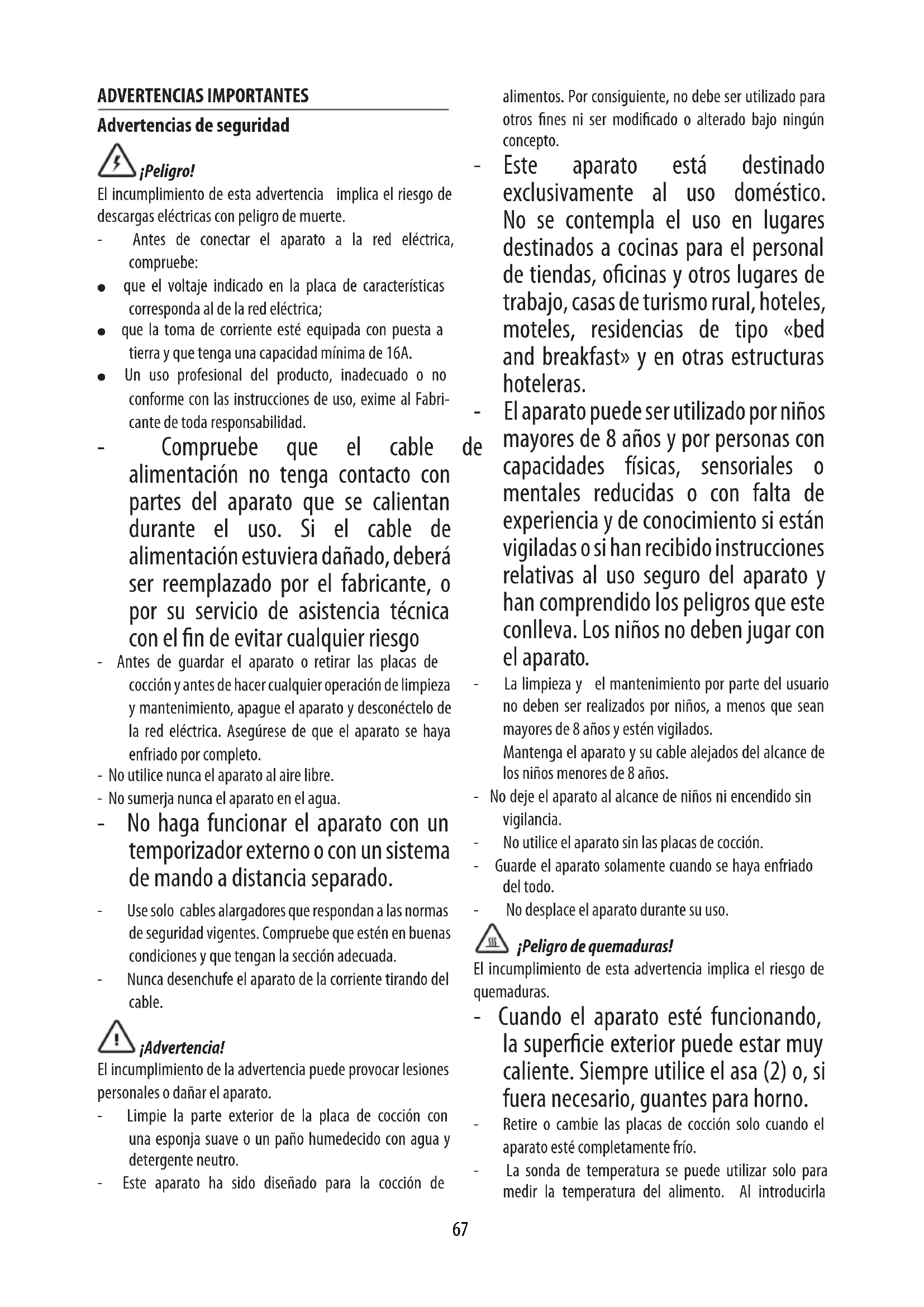 DOSES POUR: 8-10 gaufres PRÉPARATION: 10 minutes TEMPS DE CUISSON: 15 minutes INGRÉDIENTS: - 460g de farine 00 - 1 cuillère à café de sel - 3g de levure à gâteau - 170g de sucre - 2 œufs - 1345g de lait tiède - 80g de beurre - 1 cuillère à café d'extrait de vanille - 140g de chocolat noir - 60g de cacao en poudre - 6g de cannelle PRÉPARATION: Insérer les plaques pou gaufres. Mettre le chocolat et le beurre dans un saladier pour micro-ondes et faire chauer au four à micro-ondes à la puissance maximum pendant 30 secondes. Mélanger jusqu'à ce que le chocolat et le beurre soient complètement fondus et que la pâte soit lisse. Laisser refroidir légèrement.66 Dans un grand saladier battre avec un fouet les œufs, le lait et la vanille, incorporer le mélange beurre et chocolat refroidi, et mélanger jusqu'à obtenir une préparation lisse. Tamiser la farine, le sucre, le cacao en poudre, la cannelle, la levure et le sel ensemble dans un grand saladier. Ajouter le mélange de farine et des autres ingrédients aux œufs et mélanger le tout avec un fouet jusqu'à ce que la pâte soit susamment lisse. Régler les thermostats sur la position souhaitée. Préchauer la plaque à gaufres. Lorsque l'écran ache le message « READY », graisser la plaque à gaufre avec du beurre fondu ou un spray de cuisine anti-adhésif et verser une dose de pâte dans chaque moule de la plaque, à l'aide d'une cuillère si nécessaire. Étendre le pâte avec une spatule. Cuire les gaufres jusqu'à ce qu'elles soient bien dorées et croustillantes (5min). Répéter l'opération jusqu'à ce qu'il n'y ait plus de pâte. Servir immédiatement.67 ADVERTENCIAS IMPORTANTES Advertencias de seguridad ¡Peligro! El incumplimiento de esta advertencia implica el riesgo de descargas eléctricas con peligro de muerte. - Antes de conectar el aparato a la red eléctrica, compruebe: ● que el voltaje indicado en la placa de características corresponda al de la red eléctrica; ● que la toma de corriente esté equipada con puesta a tierra y que tenga una capacidad mínima de 16A. ● Un uso profesional del producto, inadecuado o no conforme con las instrucciones de uso, exime al Fabri- cante de toda responsabilidad. - Compruebe que el cable de alimentación no tenga contacto con partes del aparato que se calientan durante el uso. Si el cable de alimentación estuviera dañado, deberá ser reemplazado por el fabricante, o por su servicio de asistencia técnica con el n de evitar cualquier riesgo - Antes de guardar el aparato o retirar las placas de cocción y antes de hacer cualquier operación de limpieza y mantenimiento, apague el aparato y desconéctelo de la red eléctrica. Asegúrese de que el aparato se haya enfriado por completo. - No utilice nunca el aparato al aire libre. - No sumerja nunca el aparato en el agua. - No haga funcionar el aparato con un temporizador externo o con un sistema de mando a distancia separado. - Use solo cables alargadores que respondan a las normas de seguridad vigentes. Compruebe que estén en buenas condiciones y que tengan la sección adecuada. - Nunca desenchufe el aparato de la corriente tirando del cable. ¡Advertencia! El incumplimiento de la advertencia puede provocar lesiones personales o dañar el aparato. - Limpie la parte exterior de la placa de cocción con una esponja suave o un paño humedecido con agua y detergente neutro. - Este aparato ha sido diseñado para la cocción de alimentos. Por consiguiente, no debe ser utilizado para otros nes ni ser modicado o alterado bajo ningún concepto. - Este aparato está destinado exclusivamente al uso doméstico. No se contempla el uso en lugares destinados a cocinas para el personal de tiendas, ocinas y otros lugares de trabajo, casas de turismo rural, hoteles, moteles, residencias de tipo «bed and breakfast» y en otras estructuras hoteleras. - El aparato puede ser utilizado por niños mayores de 8 años y por personas con capacidades físicas, sensoriales o mentales reducidas o con falta de experiencia y de conocimiento si están vigiladas o si han recibido instrucciones relativas al uso seguro del aparato y han comprendido los peligros que este conlleva. Los niños no deben jugar con el aparato. - La limpieza y el mantenimiento por parte del usuario no deben ser realizados por niños, a menos que sean mayores de 8 años y estén vigilados. Mantenga el aparato y su cable alejados del alcance de los niños menores de 8 años. - No deje el aparato al alcance de niños ni encendido sin vigilancia. - No utilice el aparato sin las placas de cocción. - Guarde el aparato solamente cuando se haya enfriado del todo. - No desplace el aparato durante su uso. ¡Peligro de quemaduras! El incumplimiento de esta advertencia implica el riesgo de quemaduras. - Cuando el aparato esté funcionando, la supercie exterior puede estar muy caliente. Siempre utilice el asa (2) o, si fuera necesario, guantes para horno. - Retire o cambie las placas de cocción solo cuando el aparato esté completamente frío. - La sonda de temperatura se puede utilizar solo para medir la temperatura del alimento. Al introducirla68 en el alimento, ¡tenga cuidado de no tocar las partes calientes! Nota: Este símbolo destaca consejos e información importantes para el usuario. - Para evitar el riesgo de incendio, no cueza alimentos envueltos en película de plástico o aluminio o en bolsas plásticas. - Después de la limpieza, las placas de cocción deben estar secas antes de volverlas a instalar en el aparato. Este aparato responde al Reglamento (CE) 1935/2004 sobre los materiales y objetos destinados a entrar en contacto con alimentos. Eliminación del aparato El aparato no debe eliminarse junto con los residuos domésticos, sino que se deberá llevar a un centro autorizado para la recogida selectiva y reciclaje. DESCRIPCIÓN