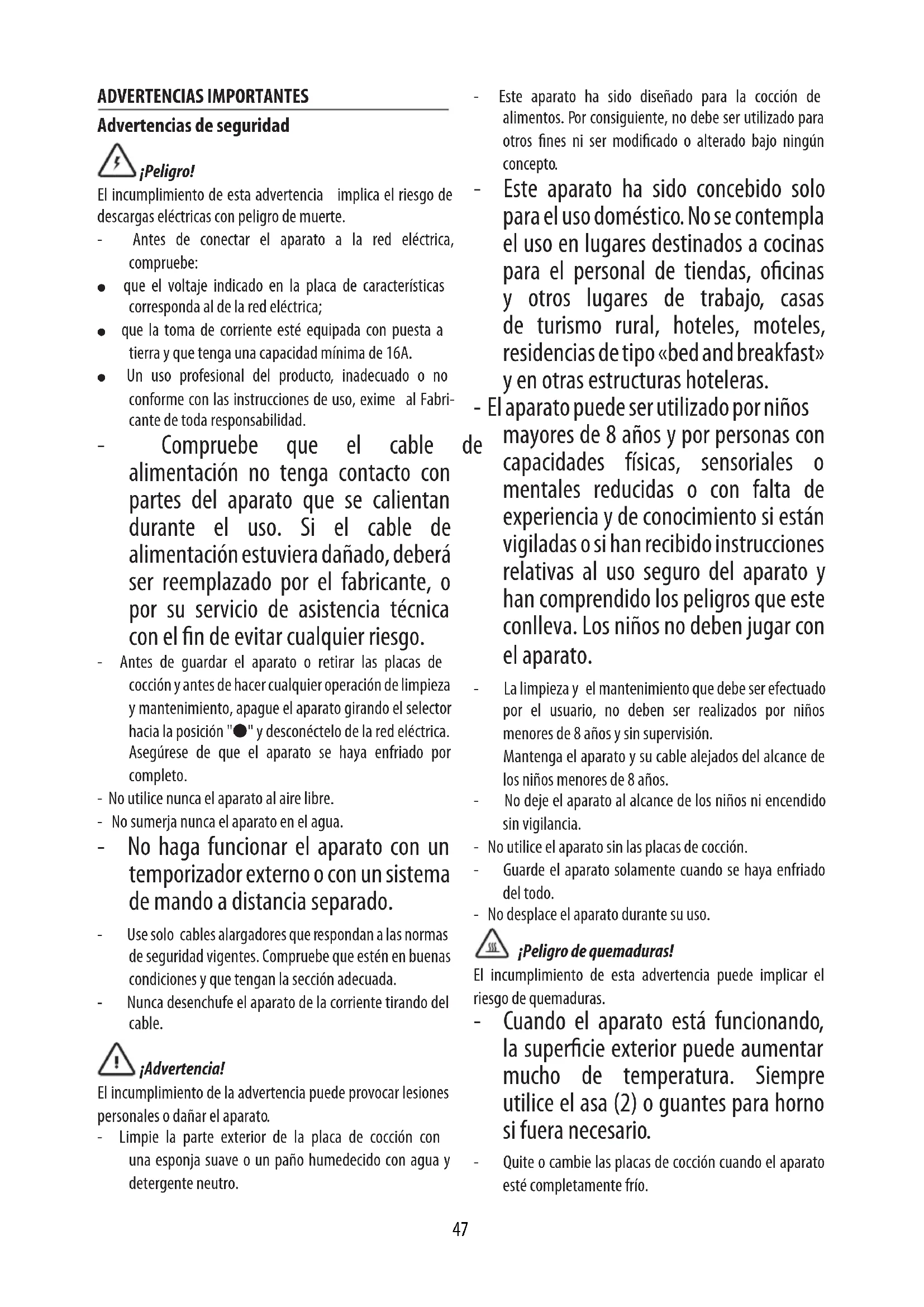 INGRÉDIENTS: - 1 ananas - miel à volonté - sucre de canne - menthe fraîche - sucre glace - glace à la vanille PRÉPARATION : Retirer les feuilles et la peau de l'ananas. Couper ensuite le fruit en tranches d'une épaisseur d'environ 1-2 cm et saupoudrer chaque tranche de sucre de canne des deux côtés. Insérer la plaque grill en bas, la plaque lisse en haut, mettre l'appareil en mode GRILL PAR CONTACT. Mettre le thermostat inférieur et supérieur sur MED. Appuyer sur le bouton START / STOP pour préchauer le grill. Quand les voyants de la plaque supérieure et inférieure s'éteignent, badigeonner l'ananas de miel des deux côtés et le poser sur la plaque. Fermer le grill et faire cuire 5-6 min. Lorsqu'elles sont cuites, mettre les tranches dans un plat, décorer avec des feuilles de menthe fraîche, saupoudrer de sucre glace et servir avec des boules de glace.47 ADVERTENCIAS IMPORTANTES Advertencias de seguridad ¡Peligro! El incumplimiento de esta advertencia implica el riesgo de descargas eléctricas con peligro de muerte. - Antes de conectar el aparato a la red eléctrica, compruebe: ● que el voltaje indicado en la placa de características corresponda al de la red eléctrica; ● que la toma de corriente esté equipada con puesta a tierra y que tenga una capacidad mínima de 16A. ● Un uso profesional del producto, inadecuado o no conforme con las instrucciones de uso, exime al Fabri- cante de toda responsabilidad. - Compruebe que el cable de alimentación no tenga contacto con partes del aparato que se calientan durante el uso. Si el cable de alimentación estuviera dañado, deberá ser reemplazado por el fabricante, o por su servicio de asistencia técnica con el n de evitar cualquier riesgo. - Antes de guardar el aparato o retirar las placas de cocción y antes de hacer cualquier operación de limpieza y mantenimiento, apague el aparato girando el selector hacia la posición "●" y desconéctelo de la red eléctrica. Asegúrese de que el aparato se haya enfriado por completo. - No utilice nunca el aparato al aire libre. - No sumerja nunca el aparato en el agua. - No haga funcionar el aparato con un temporizador externo o con un sistema de mando a distancia separado. - Use solo cables alargadores que respondan a las normas de seguridad vigentes. Compruebe que estén en buenas condiciones y que tengan la sección adecuada. - Nunca desenchufe el aparato de la corriente tirando del cable. ¡Advertencia! El incumplimiento de la advertencia puede provocar lesiones personales o dañar el aparato. - Limpie la parte exterior de la placa de cocción con una esponja suave o un paño humedecido con agua y detergente neutro. - Este aparato ha sido diseñado para la cocción de alimentos. Por consiguiente, no debe ser utilizado para otros nes ni ser modicado o alterado bajo ningún concepto. - Este aparato ha sido concebido solo para el uso doméstico. No se contempla el uso en lugares destinados a cocinas para el personal de tiendas, ocinas y otros lugares de trabajo, casas de turismo rural, hoteles, moteles, residencias de tipo «bed and breakfast» y en otras estructuras hoteleras. - El aparato puede ser utilizado por niños mayores de 8 años y por personas con capacidades físicas, sensoriales o mentales reducidas o con falta de experiencia y de conocimiento si están vigiladas o si han recibido instrucciones relativas al uso seguro del aparato y han comprendido los peligros que este conlleva. Los niños no deben jugar con el aparato. - La limpieza y el mantenimiento que debe ser efectuado por el usuario, no deben ser realizados por niños menores de 8 años y sin supervisión. Mantenga el aparato y su cable alejados del alcance de los niños menores de 8 años. - No deje el aparato al alcance de los niños ni encendido sin vigilancia. - No utilice el aparato sin las placas de cocción. - Guarde el aparato solamente cuando se haya enfriado del todo. - No desplace el aparato durante su uso. ¡Peligro de quemaduras! El incumplimiento de esta advertencia puede implicar el riesgo de quemaduras. - Cuando el aparato está funcionando, la supercie exterior puede aumentar mucho de temperatura. Siempre utilice el asa (2) o guantes para horno si fuera necesario. - Quite o cambie las placas de cocción cuando el aparato esté completamente frío.48 Nota: Este símbolo destaca consejos e información importantes para el usuario. - Para evitar el riesgo de incendio, no cueza alimentos envueltos en película de plástico o aluminio o en bolsas plásticas. Este aparato responde al Reglamento (CE) 1935/2004 sobre los materiales y objetos destinados a entrar en contacto con alimentos. Eliminación del aparato El aparato no debe eliminarse con los residuos domésticos, sino que se deberá llevar a un centro autorizado para la recogida selectiva y reciclaje. DESCRIPCIÓN