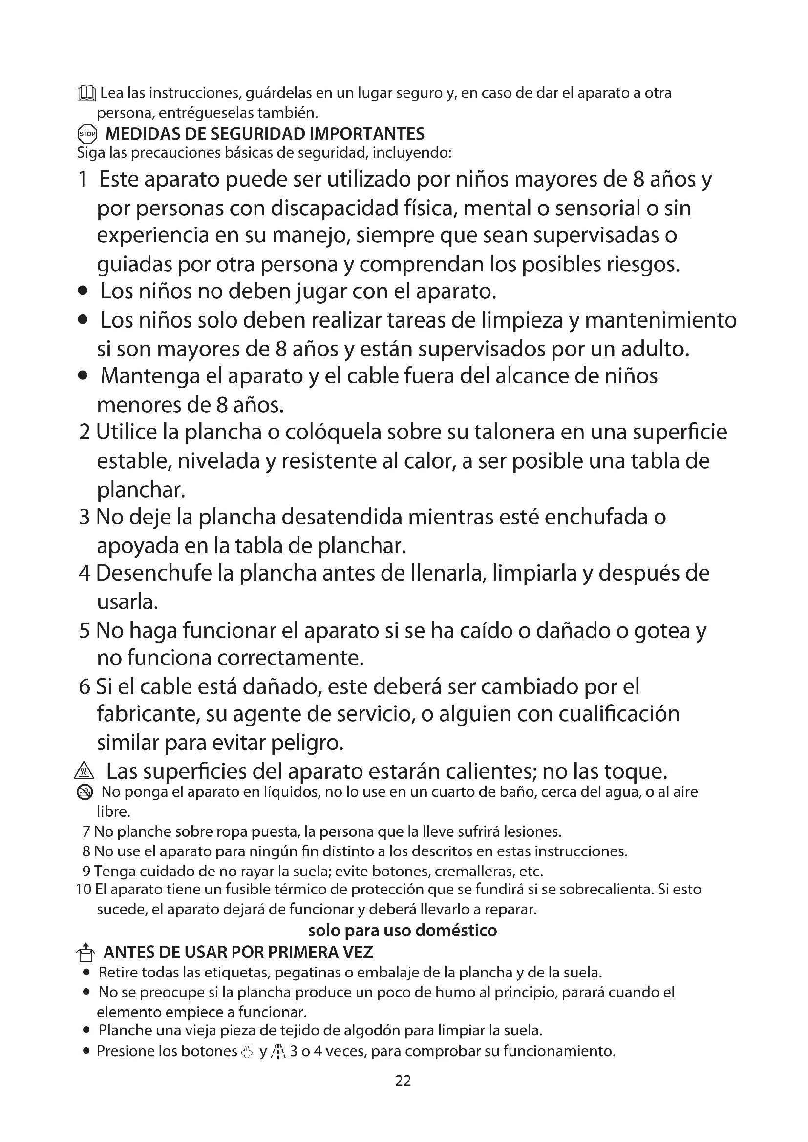 - Mantenga el aparato y el cable fuera del alcance de niños menores de 8 años. 2 Utilice la plancha o colóquela sobre su talonera en una superficie estable, nivelada y resistente al calor, a ser posible una tabla de planchar. 3 No deje la plancha desatendida mientras esté enchufada o apoyada en la tabla de planchar. 4 Desenchufe la plancha antes de llenarla, limpiarla y después de usarla. 5 No haga funcionar el aparato si se ha caído o dañado o gotea y no funciona correctamente. 6 Si el cable está dañado, este deberá ser cambiado por el fabricante, su agente de servicio, o alguien con cualificación similar para evitar peligro. h Las superficies del aparato estarán calientes; no las toque. L No ponga el aparato en líquidos, no lo use en un cuarto de baño, cerca del agua, o al aire libre. 7 No planche sobre ropa puesta, la persona que la lleve sufrirá lesiones. 8 No use el aparato para ningún fin distinto a los descritos en estas instrucciones. 9 Tenga cuidado de no rayar la suela; evite botones, cremalleras, etc. 10 El aparato tiene un fusible térmico de protección que se fundirá si se sobrecalienta. Si esto sucede, el aparato dejará de funcionar y deberá llevarlo a reparar. solo para uso doméstico U ANTES DE USAR POR PRIMERA VEZ