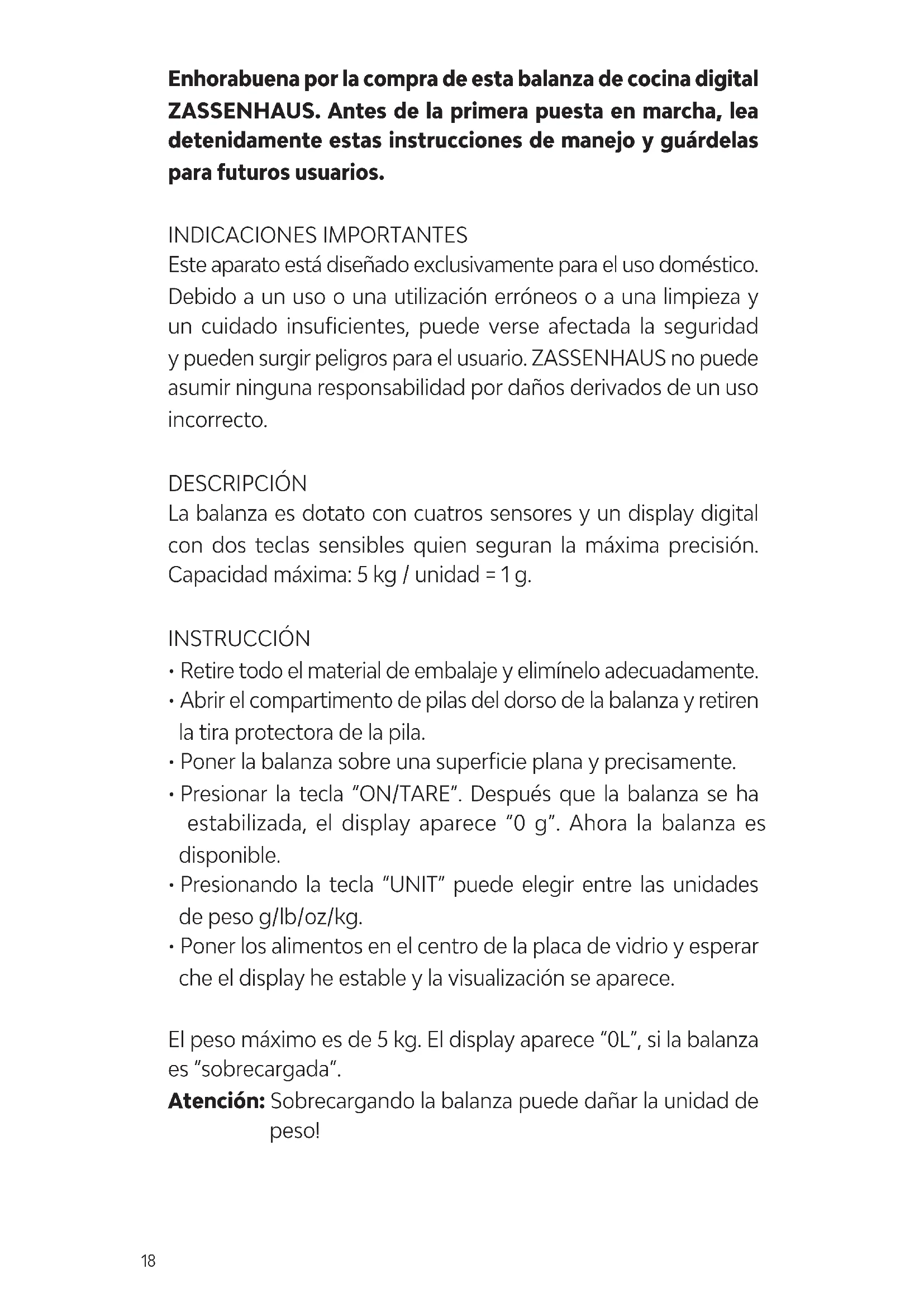BALANCE BA Digital Waage "Balance" 073xxx.qxp_Layout 1 19.10.22 12:08 Seite 1718 Enhorabuena por la compra de esta balanza de cocina digital ZASSENHAUS. Antes de la primera puesta en marcha, lea detenidamente estas instrucciones de manejo y guárdelas para futuros usuarios. INDICACIONES IMPORTANTES Este aparato está diseñado exclusivamente para el uso doméstico. Debido a un uso o una utilización erróneos o a una limpieza y un cuidado insuficientes, puede verse afectada la seguridad y pueden surgir peligros para el usuario. ZASSENHAUS no puede asumir ninguna responsabilidad por daños derivados de un uso incorrecto. DESCRIPCIÓN La balanza es dotato con cuatros sensores y un display digital con dos teclas sensibles quien seguran la máxima precisión. Capacidad máxima: 5 kg / unidad = 1 g. INSTRUCCIÓN