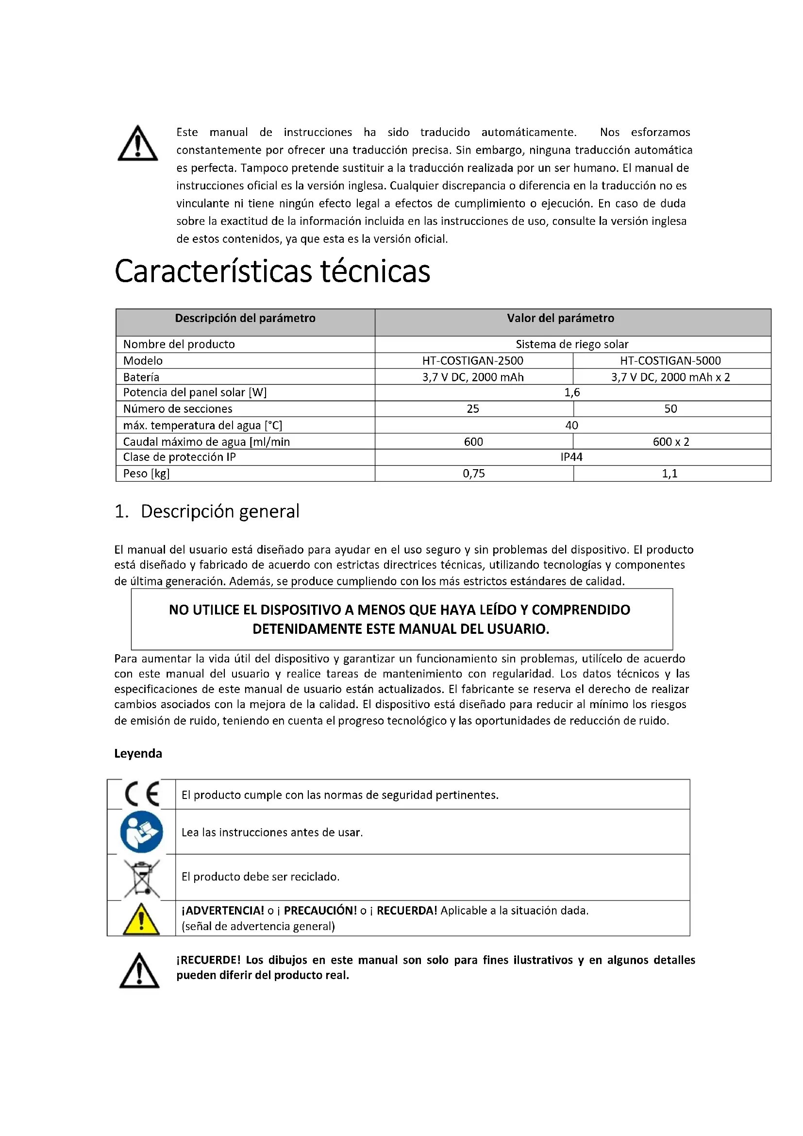 Batería baja : si la batería está descargada, permita que el panel solar cargue la bomba durante al menos 6-8 horas bajo la luz solar directa y no encienda el riego con frecuencia. Bajo nivel de agua : si no hay suficiente agua en el contenedor de agua, el riego se apagará, rellene el agua en el contenedor. Función de ciclo : este sistema de riego ha sido diseñado con una función de ciclo para el funcionamiento nocturno. Simplemente configure el tiempo para que la bomba funcione la primera vez y la bomba funcionará cada ciclo. 3.4. Limpieza y mantenimiento a) Utilice únicamente limpiadores no corrosivos para limpiar la superficie. b) Guarde la unidad en un lugar fresco y seco, libre de humedad y exposición directa a la luz solar. c) No rocíe el dispositivo con un chorro de agua ni lo sumerja en agua. d) El dispositivo debe ser inspeccionado regularmente para verificar su eficiencia técnica y detectar cualquier daño. e) Para limpiar, debe utilizarse solamente un paño suave. f) No utilice objetos afilados y/o metálicos para la limpieza (por ejemplo, un cepillo de alambre o una espátula de metal) porque pueden dañar el material de la superficie del aparato. g) No limpie el dispositivo con sustancias ácidas, agentes de uso médico, diluyentes, combustibles, aceites u otras sustancias químicas porque pueden dañar el dispositivo. h) El panel solar debe limpiarse periódicamente para optimizar la carga de las células. EXTRACCIÓN SEGURA DE PILAS Y PILAS RECARGABLES: Las baterías de 3,7 V CC, 2000 mAh están instaladas en los dispositivos. Quite las baterías usadas del dispositivo utilizando el mismo procedimiento con el que las instaló. Recicle las baterías con la organización o empresa adecuada. ELIMINACIÓN DE DISPOSITIVOS USADOS: No deseche este dispositivo en los sistemas de residuos municipales. Entréguelo en un punto de recogida y reciclaje de aparatos eléctricos y eléctricos. Verifique el símbolo en el producto, manual de instrucciones y empaque. Los plásticos utilizados para construir el dispositivo se pueden reciclar de acuerdo con sus marcas. Al elegir reciclar, está haciendo una contribución significativa a la protección de nuestro medio ambiente. Póngase en contacto con las autoridades locales para obtener información sobre su centro de reciclaje local.Kérjük, vegye figyelembe, hogy ez a használati útmutató gépi fordítással készült. Arra törekszünk, hogy a fordítások a lehető legpontosabbak legyenek, azonban egyetlen gépi fordítás sem tökéletes, és nem is célja, hogy helyettesítse az emberi fordítást. A hivatalos használati útmutató az angol nyelvű változat. A fordításban keletkezett eltérések vagy különbségek nem kötelező érvényűek, és nincs jogi hatásuk a megfelelőség vagy a végrehajtás szempontjából. Ha bármilyen kérdés merül fel a használati útmutatóban szereplő információk pontosságával kapcsolatban, kérjük, hivatkozzon ezen tartalmak angol nyelvű változatára, amely a hivatalos változat. Műszaki adatok Paraméter leírása Paraméter értéke Precíziós mérleg Napelemes öntözőrendszer Modell HT-COSTIGAN-2500 HT-COSTIGAN-5000 Akkumulátor 3,7 V DC, 2000 mAh 3,7 V DC, 2000 mAh x 2 Napelem teljesítmény [W] 1,6 A szakaszok száma