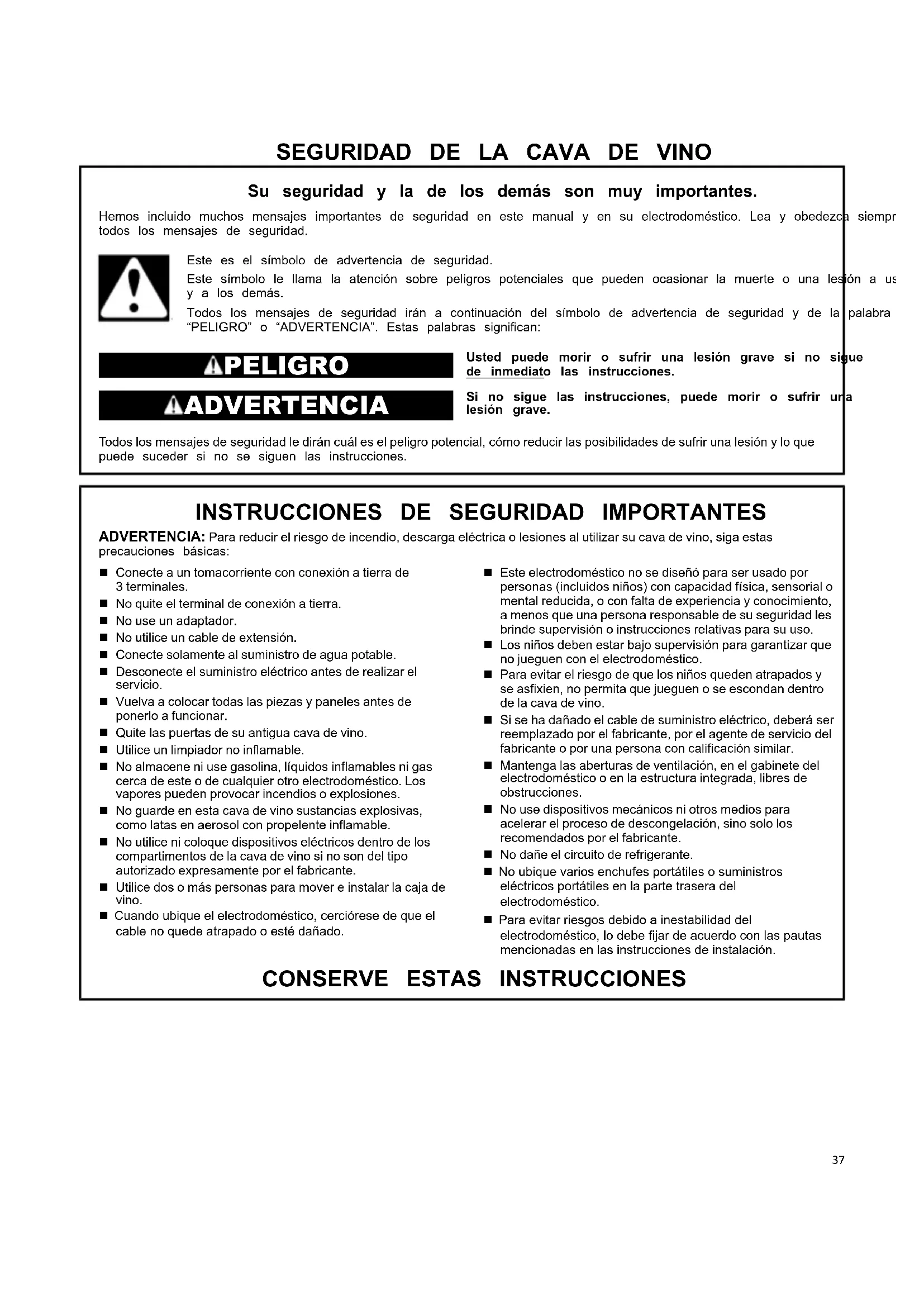 ADVERTENCIA: Para reducir el riesgo de incendio, descarga eléctrica o lesiones al utilizar su cava de vino, siga estas precauciones básicas: Conecte a un tomacorriente con conexión a tierra de 3 terminales. No quite el terminal de conexión a tierra. No use un adaptador. No utilice un cable de extensión. Conecte solamente al suministro de agua potable. Desconecte el suministro eléctrico antes de realizar el servicio. Vuelva a colocar todas las piezas y paneles antes de ponerlo a funcionar. Quite las puertas de su antigua cava de vino. Utilice un limpiador no inflamable. No almacene ni use gasolina, líquidos inflamables ni gas cerca de este o de cualquier otro electrodoméstico. Los vapores pueden provocar incendios o explosiones. No guarde en esta cava de vino sustancias explosivas, como latas en aerosol con propelente inflamable. No utilice ni coloque dispositivos eléctricos dentro de los compartimentos de la cava de vino si no son del tipo autorizado expresamente por el fabricante. Utilice dos o más personas para mover e instalar la caja de vino. Cuando ubique el electrodoméstico, cerciórese de que el cable no quede atrapado o esté dañado. Este electrodoméstico no se diseñó para ser usado por personas (incluidos niños) con capacidad física, sensorial o mental reducida, o con falta de experiencia y conocimiento, a menos que una persona responsable de su seguridad les brinde supervisión o instrucciones relativas para su uso. Los niños deben estar bajo supervisión para garantizar que no jueguen con el electrodoméstico. Para evitar el riesgo de que los niños queden atrapados y se asfixien, no permita que jueguen o se escondan dentro de la cava de vino. Si se ha dañado el cable de suministro eléctrico, deberá ser reemplazado por el fabricante, por el agente de servicio del fabricante o por una persona con calificación similar. Mantenga las aberturas de ventilación, en el gabinete del electrodoméstico o en la estructura integrada, libres de obstrucciones. No use dispositivos mecánicos ni otros medios para acelerar el proceso de descongelación, sino solo los recomendados por el fabricante. No dañe el circuito de refrigerante. No ubique varios enchufes portátiles o suministros eléctricos portátiles en la parte trasera del electrodoméstico. Para evitar riesgos debido a inestabilidad del electrodoméstico, lo debe fijar de acuerdo con las pautas mencionadas en las instrucciones de instalación.