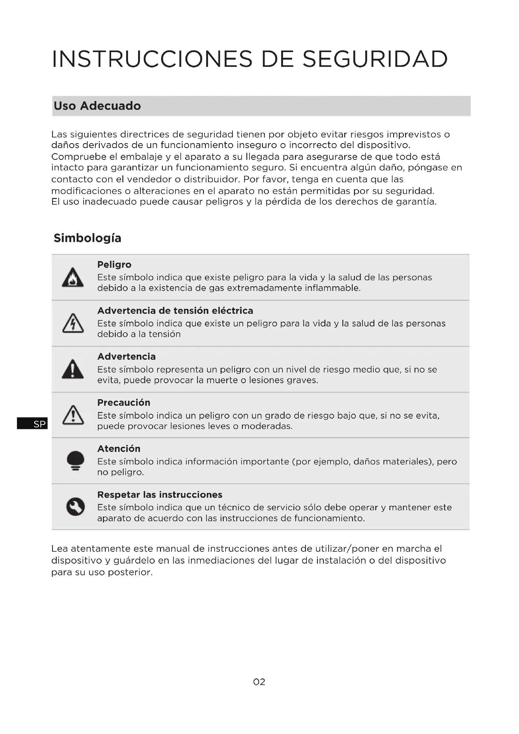 SPPeligro Advertencia de tensión eléctrica Advertencia Precaución Atención Respetar las instrucciones Uso Adecuado Simbología