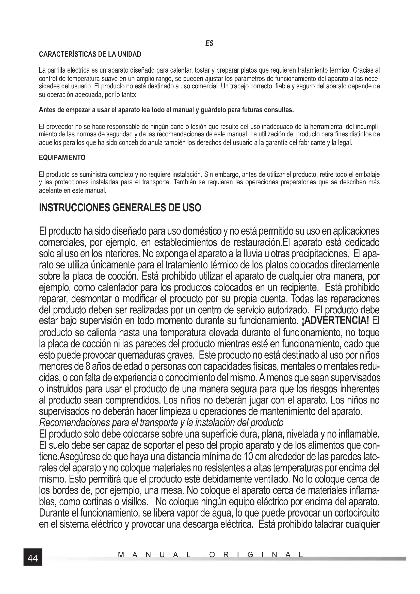 El producto ha sido diseñado para uso doméstico y no está permitido su uso en aplicaciones comerciales, por ejemplo, en establecimientos de restauración.El aparato está dedicado solo al uso en los interiores. No exponga el aparato a la lluvia u otras precipitaciones. El apa- rato se utiliza únicamente para el tratamiento térmico de los platos colocados directamente sobre la placa de cocción. Está prohibido utilizar el aparato de cualquier otra manera, por ejemplo, como calentador para los productos colocados en un recipiente. Está prohibido reparar, desmontar o modifi car el producto por su propia cuenta. Todas las reparaciones del producto deben ser realizadas por un centro de servicio autorizado. El producto debe estar bajo supervisión en todo momento durante su funcionamiento. ¡ADVERTENCIA! El producto se calienta hasta una temperatura elevada durante el funcionamiento, no toque la placa de cocción ni las paredes del producto mientras esté en funcionamiento, dado que esto puede provocar quemaduras graves. Este producto no está destinado al uso por niños menores de 8 años de edad o personas con capacidades físicas, mentales o mentales redu- cidas, o con falta de experiencia o conocimiento del mismo. A menos que sean supervisados o instruidos para usar el producto de una manera segura para que los riesgos inherentes al producto sean comprendidos. Los niños no deberán jugar con el aparato. Los niños no supervisados no deberán hacer limpieza u operaciones de mantenimiento del aparato. Recomendaciones para el transporte y la instalación del producto El producto solo debe colocarse sobre una superfi cie dura, plana, nivelada y no infl amable. El suelo debe ser capaz de soportar el peso del propio aparato y de los alimentos que con- tiene.Asegúrese de que haya una distancia mínima de 10 cm alrededor de las paredes late- rales del aparato y no coloque materiales no resistentes a altas temperaturas por encima del mismo. Esto permitirá que el producto esté debidamente ventilado. No lo coloque cerca de los bordes de, por ejemplo, una mesa. No coloque el aparato cerca de materiales infl ama- bles, como cortinas o visillos. No coloque ningún equipo eléctrico por encima del aparato. Durante el funcionamiento, se libera vapor de agua, lo que puede provocar un cortocircuito en el sistema eléctrico y provocar una descarga eléctrica. Está prohibido taladrar cualquier45 MANUAL ORIGINAL