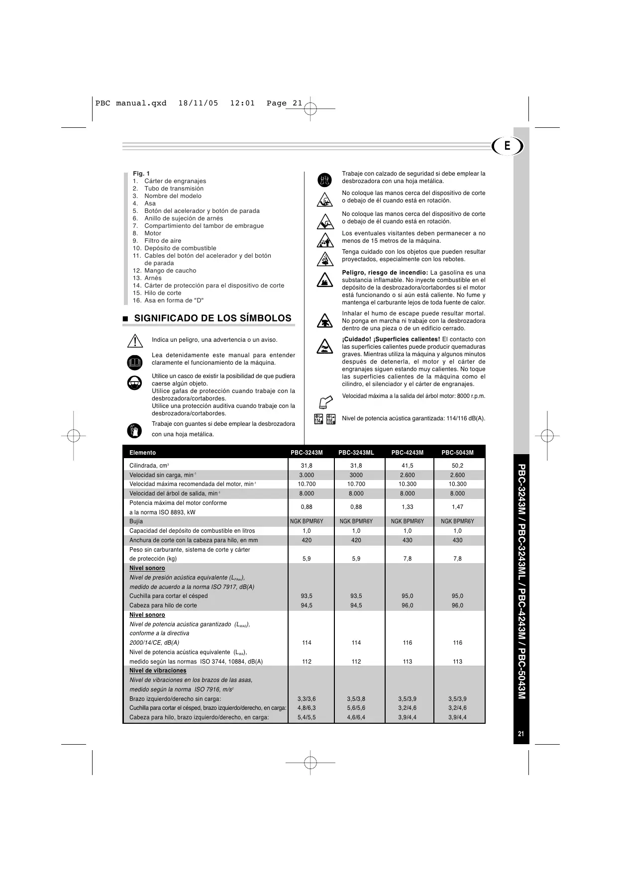 ¡Cuidado! ¡Superficies calientes! El contacto con las superficies calientes puede producir quemaduras graves. Mientras utiliza la máquina y algunos minutos después de detenerla, el motor y el cárter de engranajes siguen estando muy calientes. No toque las superficies calientes de la máquina como el cilindro, el silenciador y el cárter de engranajes. Indica un peligro, una advertencia o un aviso. Lea detenidamente este manual para entender claramente el funcionamiento de la máquina. Utilice un casco de existir la posibilidad de que pudiera caerse algún objeto. Utilice gafas de protección cuando trabaje con la desbrozadora/cortabordes. Utilice una protección auditiva cuando trabaje con la desbrozadora/cortabordes. Velocidad máxima a la salida del árbol motor: 8000 r.p.m. Nivel de potencia acústica garantizada: 114/116 dB(A). Trabaje con guantes si debe emplear la desbrozadora con una hoja metálica. Elemento Nivel de potencia acústica garantizado (LWAG), conforme a la directiva 2000/14/CE, dB(A) Nivel de potencia acústica equivalente (LWA), medido según las normas ISO 3744, 10884, dB(A) Nivel de vibraciones Nivel de vibraciones en los brazos de las asas, medido según la norma ISO 7916, m/s2 Brazo izquierdo/derecho sin carga: Cuchilla para cortar el césped, brazo izquierdo/derecho, en carga: Cabeza para hilo, brazo izquierdo/derecho, en carga: PBC-3243M PBC-3243ML PBC-4243M PBC-5043M 31,8