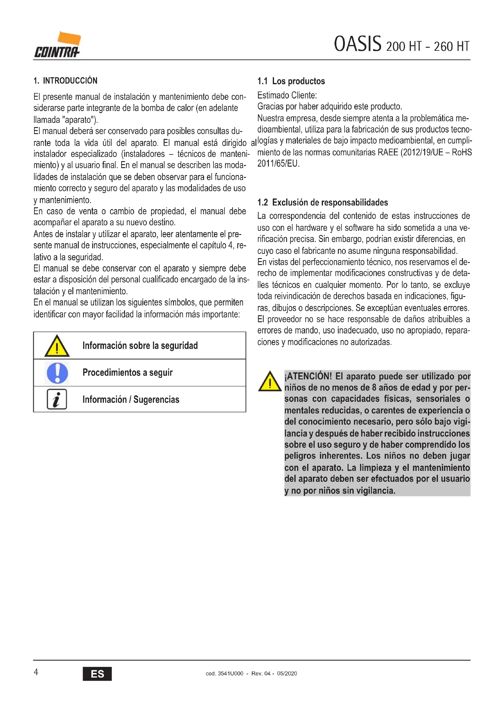 Se produce la transferencia de la Propiedad de la Mercancía cuando se efectúa el pago íntegro de la misma. PERÍODO El período de Garantía para los equipos de aire acondicionado afectados por este documento es de 2 años de Garantía Total a partir de la fecha de factura de venta, siempre y cuando haya sido instalado en un plazo máximo de 12 meses desde la fecha de expedición y salida de los almacenes de COINTRA. ALCANCE La Garantía contempla: - Atención de avisos de averías. - Reparación o cambio de los componentes o piezas defectuosas de los equipos afectados y la mano de obra y gastos de desplazamiento asociados. - También quedan cubiertos por la presente Garantía todos los componentes opcionales y accesorios incorporados a los equipos suministrados por COINTRA.Quedan exentos de la Garantía: - La instalación de los equipos. - Los elementos incorporados en los mismos no suministrados por COINTRA - La instalación de opciones o accesorios no fabricados por COINTRA - Los daños causados por la incorrecta instalación de alguno de los elementos indicados anteriormente. PÉRDIDA DE LA GARANTÍA La Garantía no cubre las incidencias producidas por: - La alimentación eléctrica de las máquinas con grupos electrógenos o cualquier otro sistema que no sea una red eléctrica estable y de suficiente capacidad. - Transporte no efectuado a cargo de COINTRA. - Corrosiones, deformaciones o golpes producidos por un almacenamiento inadecuado. - Incorrecta manipulación o mantenimiento inadecuado de los equipos. - Intervención en el producto por personal no capacitado o habilitado por COINTRA durante el período de Garantía. - Montaje no acorde con las instrucciones que se suministran en los equipos. - Funcionamiento fuera de los rangos establecidos en la documentación técnica de COINTRA - Instalación del equipo que no sea conforme a las Leyes y Reglamentaciones en vigor (electricidad, hidráulicas, frigoríficas, etc.). - Defectos en las instalaciones eléctrica, hidráulica o aerólica, por alimentación fuera de rango, falta de protecciones eléctricas, secciones de conducciones insuficientes, obstrucciones o cualquier defectoatribuible a la instalación. - Anomalías causadas por agentes atmosféricos (hielos, rayos, inundaciones, etc.) así como por corrientes erráticas. - Las averías ocasionadas por el deterioro o corrosión en intercambiadores de agua ocasionados por suciedad en el circuito hidráulico o por la presencia de sustancias agresivas. - La limpieza de filtros y la sustitución de piezas deterioradas por el natural desgaste de las mismas. - Las incidencias ocasionadas por un mantenimiento inadecuado de los equipos o una carencia del mismo, o un mal uso del equipo.CONDICIONES DE LA GARANTÍA Para la solicitud de la aplicación de la Garantía es imprescindible la cumplimentación de la totalidad de los datos reseñados en el Certificado de Garantía adjunto. La convalidación de la Garantía deberá realizarse consignando en ella su fecha de compra, enviándola seguidamente a COINTRA. Las posibles reclamaciones deberán efectuarse ante el organismo competente en esta materia. La solicitud de la aplicación de la garantía se hará presentando el resguardo de Garantía que se entrega con la documentación del equipo, junto con el albarán de envío del equipo afectado y la factura de compra en el momento de cualquier intervención por parte del Servicio Técnico de COINTRA. Los sistemas accesibilidad especial a los aparatos, tales como andamios, elevadores, etc., serán aportados por cuenta del cliente. Las piezas reemplazadas durante el período de Garantía quedarán bajo la custodia y propiedad de COINTRA, siendo obligatoria su entrega. La presente Garantía no tendrá efecto si no se ha cumplido con las condiciones generales de la venta de las Unidades especificadas por COINTRA. No está incluido en la Garantía los desperfectos ocurridos durante el transporte o instalación del equipo. Los defectos observados se indicarán inmediatamente a la agencia de transportes. Todo defecto observado por golpes antes de la descarga del equipo y su consiguiente recepción por parte del cliente deberá ser notificado por escrito y detallado al SAT Central de COINTRA dentro de las 24 horas siguientes a la misma, según la fecha indicada en el albarán de entrega. De no disponer del registro de tal reclamación, COINTRA no asumirá los gastos ocasionados por tales desperfectos. El Servicio Técnico de COINTRA no realizará ningún tipo de reparación en aquellos equipos que estén instalados incumpliendo la legislación vigente, en lugares de difícil o imposible acceso, o en lugares que revistan peligrosidad para el operario. El equipo será reparado cuando dicho equipo haya sido previamente desinstalado por el cliente. COINTRA no se hará cargo de los costes de desinstalación e instalación del equipo. COINTRA declina toda responsabilidad que pueda derivarse por sucesos extraordinarios como los que pudieran derivarse en los casos de “Fuerza mayor” (incendio, catástrofes naturales, restricciones gubernativas, etc.). En cualquier caso, la Garantía se aplicará según lo indicado en el presente documento y será obligatorio en el momento de cualquier intervención del Servicio Técnico Oficial de COINTRA la presentación del albarán de entrega de los equipos y la factura de compra. Dicha garantía tiene validez, única y exclusivamente, para los aparatos vendidos e instalados en el territorio español. Datos de Contacto: Centro de Asistencia Técnica y Recepción de Avisos: 902 402 010 / 91 217 68 34OASIS 200 HT - 260 HT cod. 3541U000 - Rev. 04 - 05/2020