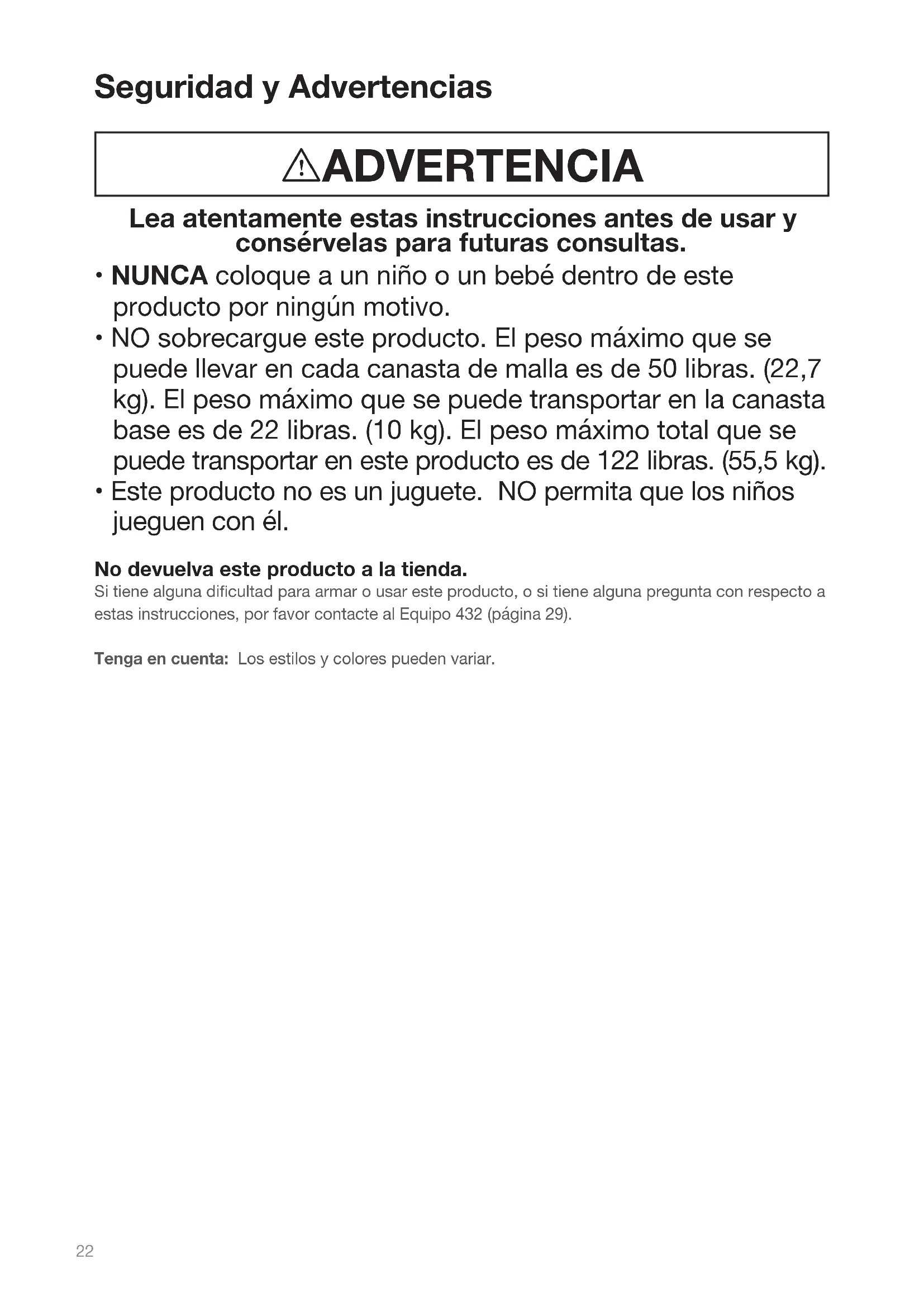 - NO sobrecargue este producto. El peso máximo que se puede llevar en cada canasta de malla es de 50 libras. (22,7 kg). El peso máximo que se puede transportar en la canasta base es de 22 libras. (10 kg). El peso máximo total que se puede transportar en este producto es de 122 libras. (55,5 kg).