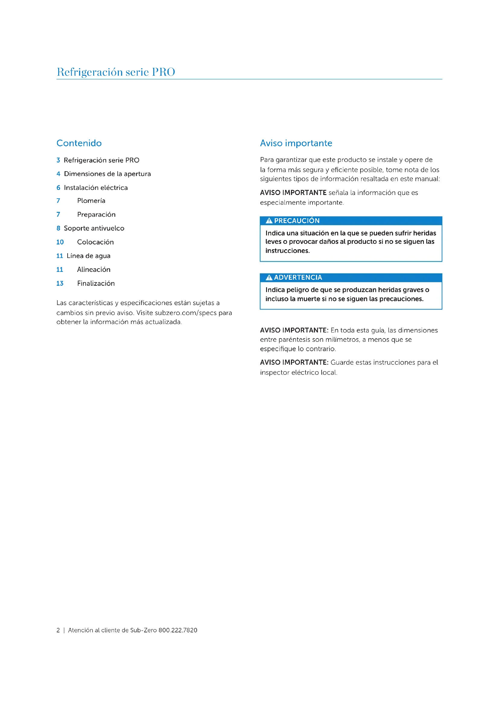 If the water filtration system will not be used, it can be bypassed by removing the water filter. To Remove the Water Filter: 1 To access the water filter, rotate the bottom of the grille upward. 2 To remove the filter, rotate counterclockwise one- quarter turn, then pull out. Refer to the illustration below. Water filter removal WATER FILTER Completion Install the grille assembly and check for proper fit. Recon- nect the network cable. Refer to page 7. Attach the net- work cable to the grille using the cable ties provided. Reinstall the drain pan and verify it is in the proper position. Install the kickplate using the screws to attach it to the brackets on the inside of each roller base. Refer to the illustration below. The kickplate must be removable for service. The floor cannot interfere with removal. Install the leg covers. For initial start up, touch and hold POWER on either external touch display, located on the grille. Kickplate installation Installationsubzero.com | 15 Completion 90° DOOR STOP The door(s) of all models open to 135°. For installations where the door opening must be limited, an optional 90° door stop kit is available through an authorized Sub-Zero dealer. For local dealer information, visit the find a show- room section of our website, subzero.com. WARNING Follow all city and state laws when storing, recycling, or discarding unused refrigerators and freezers. Sub-Zero, Sub-Zero & Design, Sub-Zero & Snowflake Design, Dual Refrigeration, The Living Kitchen, Great American Kitchens The Fine Art of Kitchen Design, Wolf, Wolf & Design, Wolf Gourmet, W & Design, red colored knobs, Cove, and Cove & Design are registered trademarks and service marks of Sub-Zero Group, Inc. and its subsidiaries. All other trademarks are property of their respective owners in the United States and other countries. Installation2 | Atención al cliente de Sub-Zero 800.222.7820 Contenido 3 Refrigeración serie PRO 4 Dimensiones de la apertura 6 Instalación eléctrica 7 Plomería 7 Preparación 8 Soporte antivuelco 10 Colocación 11 Línea de agua 11 Alineación 13 Finalización Las características y especificaciones están sujetas a cambios sin previo aviso. Visite subzero.com/specs para obtener la información más actualizada. Refrigeración serie PRO Aviso importante Para garantizar que este producto se instale y opere de la forma más segura y eficiente posible, tome nota de los siguientes tipos de información resaltada en este manual: AVISO IMPORTANTE señala la información que es especialmente importante. PRECAUCIÓN Indica una situación en la que se pueden sufrir heridas leves o provocar daños al producto si no se siguen las instrucciones. ADVERTENCIA Indica peligro de que se produzcan heridas graves o incluso la muerte si no se siguen las precauciones. AVISO IMPORTANTE: En toda esta guía, las dimensiones entre paréntesis son milímetros, a menos que se especifique lo contrario. AVISO IMPORTANTE: Guarde estas instrucciones para el inspector eléctrico local.subzero.com | 3 Información del producto La información importante del producto, incluidos el modelo y el número de serie de la unidad, se encuentra en la placa de datos del producto. La placa de datos está situada dentro del gabinete, unida a la pared interior izqui- erda de la parte inferior del cajón. Consulte la siguiente ilustración. Si necesita servicio, póngase en contacto con el centro de servicio autorizado de Sub-Zero y tenga a la mano el modelo y número de serie de la máquina. Para obtener los datos del centro de servicio autorizado de Sub-Zero más cercano o si tiene preguntas acerca de la instalación, visite la sección de Soporte de productos de nuestro sitio web, subzero.com o llame a la línea de atención al cliente de Sub-Zero al 800-222-7820. RATING PLATE RATING PLATE Ubicación de la placa de carac- terísticas para modelos de 36 " Ubicación de la placa de carac- terísticas para modelos de 48 " PLACA DE DATOS PLACA DE DATOS Refrigeración serie PRO4 | Atención al cliente de Sub-Zero 800.222.7820 Preparación del sitio Dimensiones de abertura
