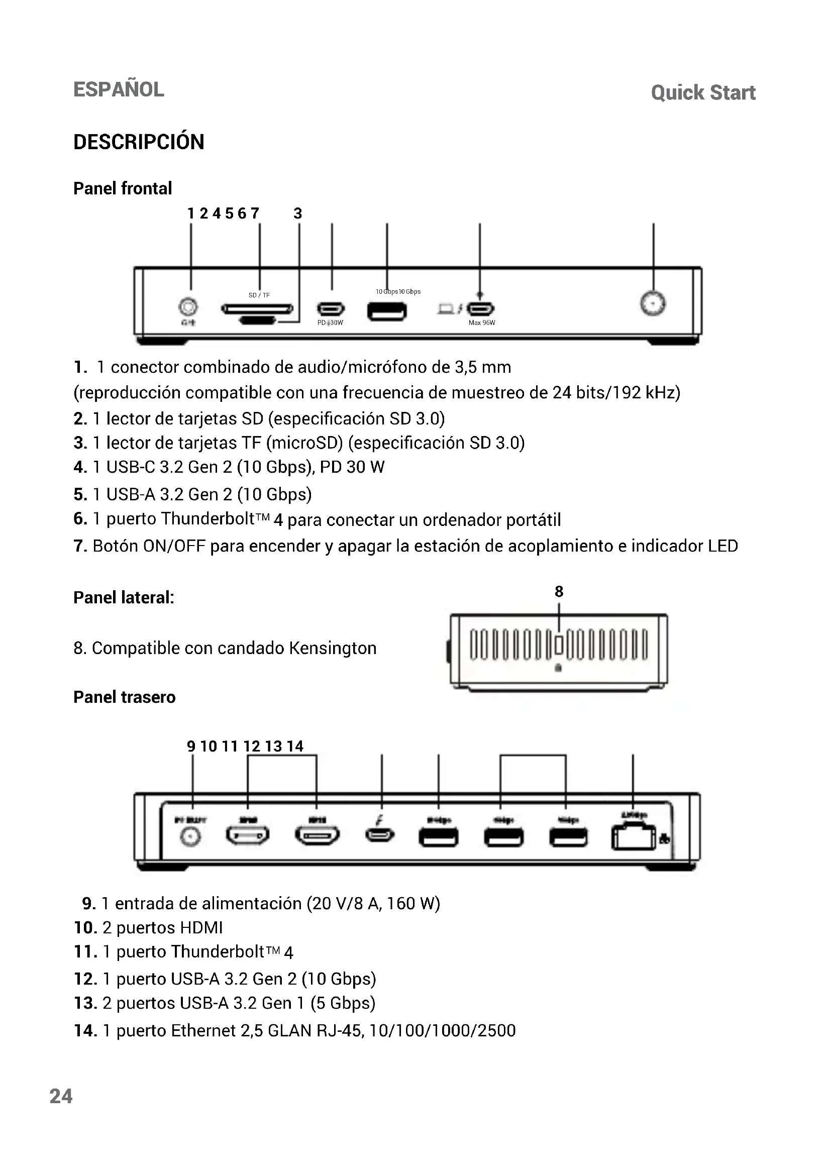 Interfaz / puerto / conector / entrada / ranura: lugar donde se conectan físicamente dos dispositivos. Controlador: componente semiconductor (denominado chipset) de un portátil o tableta que garantiza el funcionamiento de uno de los puertos. Thunderbolt™: es una rápida interfaz de hardware que permite conectar dispositivos (periféricos) al ordenador a través de un bus de expansión. Thunderbolt combina PCI•Express y DisplayPort en una interfaz de datos en serie. Permite conectar hasta 6 dispositivos Thunderbolt™ adicionales, y la velocidad de transferencia para Thunderbolt™ 3/4 es de hasta 40Gbit/s. USB-C / USB Type•C / USB4 / Thunderbolt™ 3/4 • es un conector simétrico Permite una carga más rápida, alimentación, doble función (no solo host sino también guest), compa- tibilidad con Alt Mode (DisplayPort, MHL, Thunderbolt 3, Power Delivery) y noticación de errores a través de dispositivo Billboard. USB-C Power Delivery (USB-C PD): una función opcional del conector USB-C. Un co- nector con esta compatibilidad puede tanto cargar como ser cargado, y admite cargas de 10W a 240W USB 3.2 / 3.1 / 3.0 / 2.0 • estándar para interfaz USB / puerto para conectar diversos dispositivos USB. La interfaz USB de tipo A permite conectar varios dispositivos USB a la base de conexión o al adaptador. El puerto USB de tipo B se utiliza para conectar la base de conexión o el adaptador a un ordenador portátil/tableta. HDMI/Puerto de pantalla: norma para una interfaz/puerto de grácos digitales que se utiliza para conectar monitores y otros dispositivos de visualización gráca. LAN (Local Area Network) • red de área local, actualmente la más común es la denomi- nada Ethernet, que alcanza velocidades teóricas de transferencia de hasta 2,5 Gbit/s en la estación de acoplamiento. Audio: término que designa un dispositivo de entrada (micrófono) o salida (auriculares/ altavoces) de audio.Quick Start