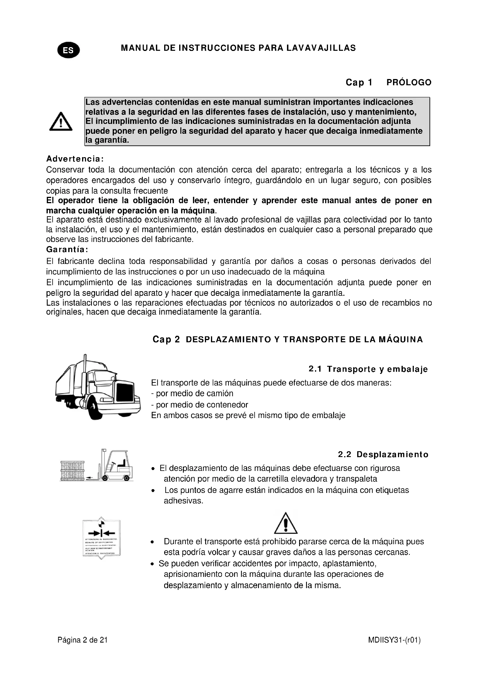 Las advertencias contenidas en este manual suministran importantes indicaciones relativas a la seguridad en las diferentes fases de instalación, uso y mantenimiento, El incumplimiento de las indicaciones suministradas en la documentación adjunta puede poner en peligro la seguridad del aparato y hacer que decaiga inmediatamente la garantía. Advertencia: Conservar toda la documentación con atención cerca del aparato; entregarla a los técnicos y a los operadores encargados del uso y conservarlo íntegro, guardándolo en un lugar seguro, con posibles copias para la consulta frecuente El operador tiene la obligación de leer, entender y aprender este manual antes de poner en marcha cualquier operación en la máquina. El aparato está destinado exclusivamente al lavado profesional de vajillas para colectividad por lo tanto la inst alación, el uso y el mantenimiento, están destinados en cualquier caso a personal preparado que observe las instrucciones del fabricante. Garantía: El fabricante declina toda responsabilidad y garantía por daños a cosas o personas derivados del incumplimiento de las instrucciones o por un uso inadecuado de la máquina El incumplimiento de las indicaciones suministradas en la documentación adjunta puede poner en peligro la seguridad del aparato y hacer que decaiga inmediatamente la garantía. Las instalaci ones o las reparaciones efectuadas por técnicos no autorizados o el uso de recambios no originales, hacen que decaiga inmediatamente la garantía. Cap 2 DESPLAZAMIENTO Y TRANSPORTE DE LA MÁQUINA