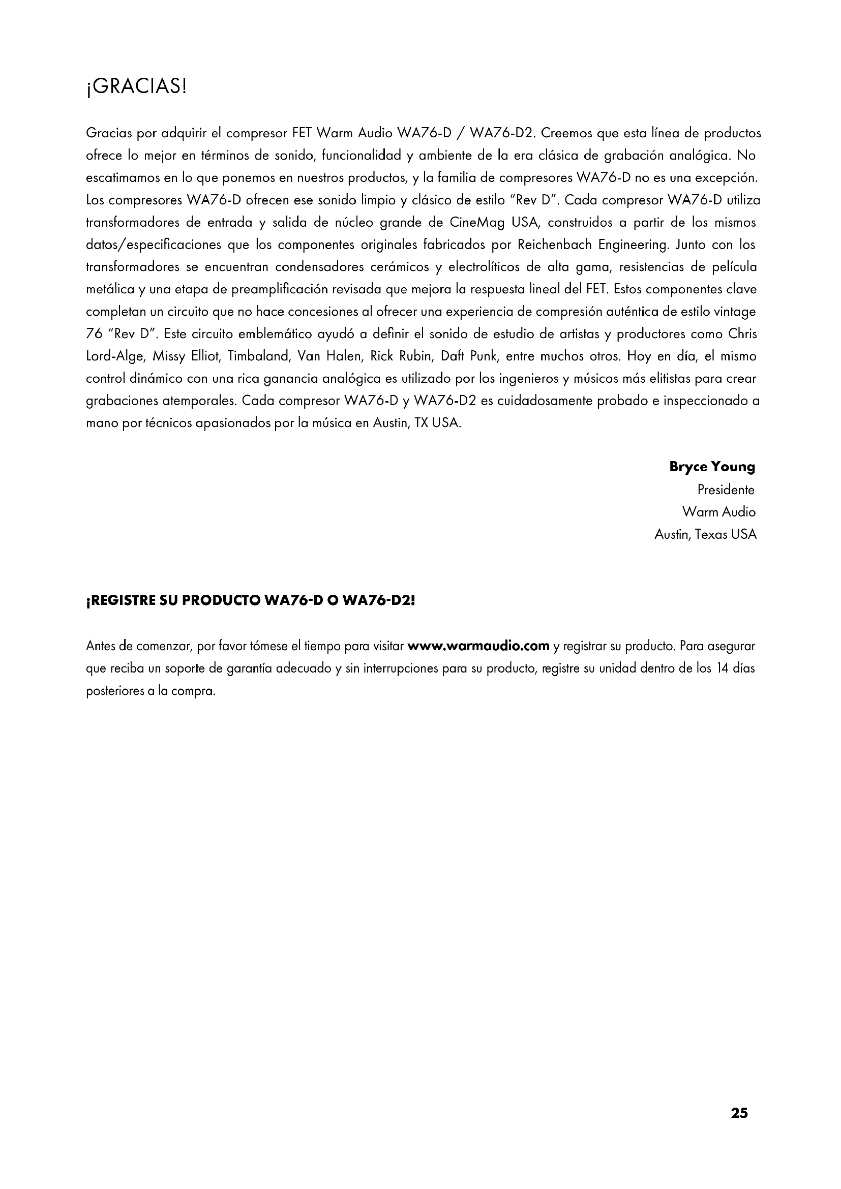 réduire les risques d’électrocution, n’effectuez aucune opération de maintenance autre que celles décrites dans les instructions d’utilisation, à moins d’être qualifié pour le fair.25 ¡GRACIAS! Gracias por adquirir el compresor FET Warm Audio WA76-D / WA76-D2. Creemos que esta línea de productos ofrece lo mejor en términos de sonido, funcionalidad y ambiente de la era clásica de grabación analógica. No escatimamos en lo que ponemos en nuestros productos, y la familia de compresores WA76-D no es una excepción. Los compresores WA76-D ofrecen ese sonido limpio y clásico de estilo “Rev D”. Cada compresor WA76-D utiliza transformadores de entrada y salida de núcleo grande de CineMag USA, construidos a partir de los mismos datos/especificaciones que los componentes originales fabricados por Reichenbach Engineering. Junto con los transformadores se encuentran condensadores cerámicos y electrolíticos de alta gama, resistencias de película metálica y una etapa de preamplificación revisada que mejora la respuesta lineal del FET. Estos componentes clave completan un circuito que no hace concesiones al ofrecer una experiencia de compresión auténtica de estilo vintage 76 “Rev D”. Este circuito emblemático ayudó a definir el sonido de estudio de artistas y productores como Chris Lord-Alge, Missy Elliot, Timbaland, Van Halen, Rick Rubin, Daft Punk, entre muchos otros. Hoy en día, el mismo control dinámico con una rica ganancia analógica es utilizado por los ingenieros y músicos más elitistas para crear grabaciones atemporales. Cada compresor WA76-D y WA76-D2 es cuidadosamente probado e inspeccionado a mano por técnicos apasionados por la música en Austin, TX USA. Bryce Young Presidente Warm Audio Austin, Texas USA ¡REGISTRE SU PRODUCTO WA76-D O WA76-D2! Antes de comenzar, por favor tómese el tiempo para visitar www.warmaudio.com y registrar su producto. Para asegurar que reciba un soporte de garantía adecuado y sin interrupciones para su producto, registre su unidad dentro de los 14 días posteriores a la compra.26