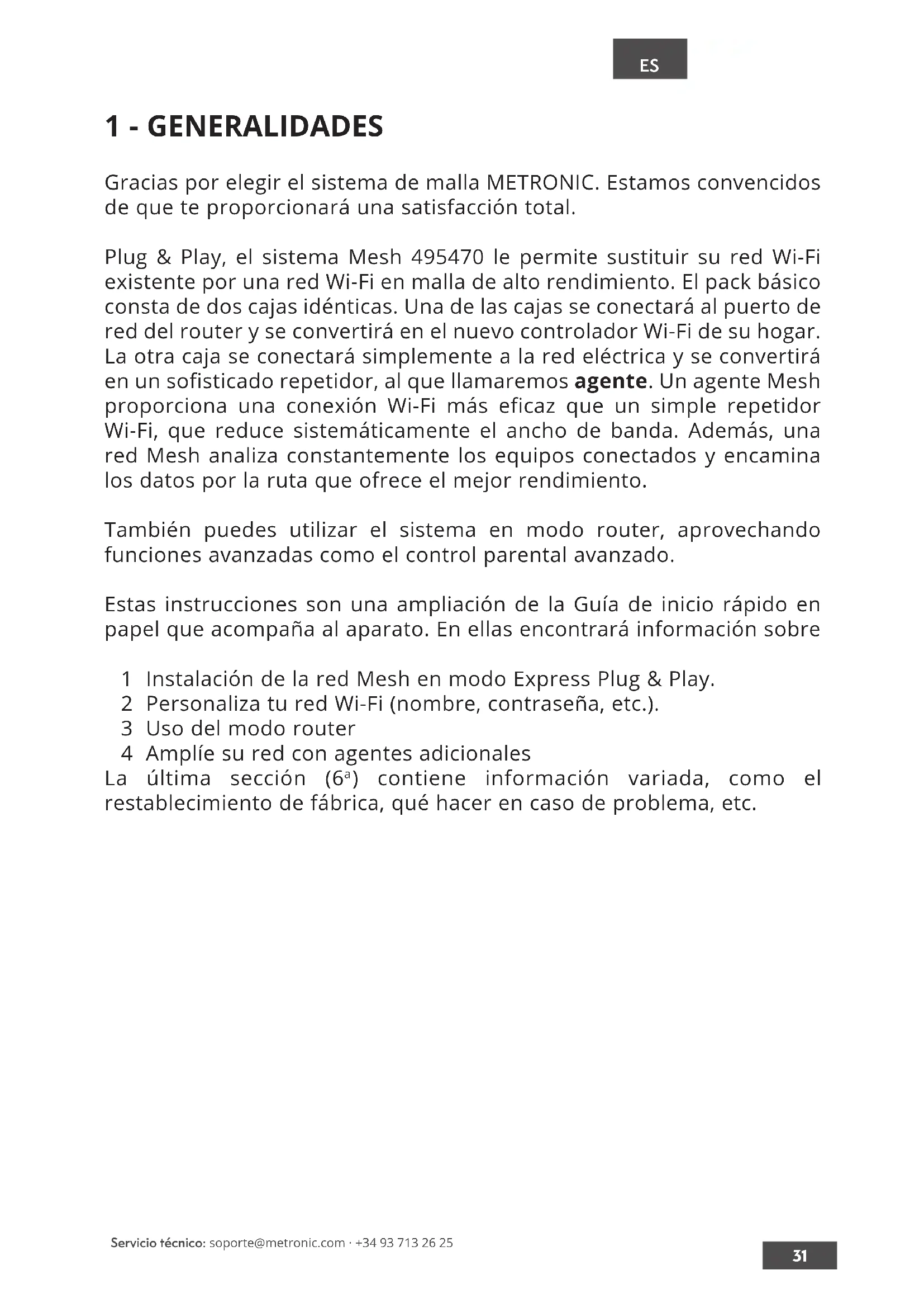Gracias por elegir el sistema de malla METRONIC. Estamos convencidos de que te proporcionará una satisfacción total. Plug & Play, el sistema Mesh 495470 le permite sustituir su red Wi-Fi existente por una red Wi-Fi en malla de alto rendimiento. El pack básico consta de dos cajas idénticas. Una de las cajas se conectará al puerto de red del router y se convertirá en el nuevo controlador Wi-Fi de su hogar. La otra caja se conectará simplemente a la red eléctrica y se convertirá en un sofisticado repetidor, al que llamaremos agente. Un agente Mesh proporciona una conexión Wi-Fi más eficaz que un simple repetidor Wi-Fi, que reduce sistemáticamente el ancho de banda. Además, una red Mesh analiza constantemente los equipos conectados y encamina los datos por la ruta que ofrece el mejor rendimiento. También puedes utilizar el sistema en modo router, aprovechando funciones avanzadas como el control parental avanzado. Estas instrucciones son una ampliación de la Guía de inicio rápido en papel que acompaña al aparato. En ellas encontrará información sobre 1 Instalación de la red Mesh en modo Express Plug & Play. 2 Personaliza tu red Wi-Fi (nombre, contraseña, etc.). 3 Uso del modo router 4 Amplíe su red con agentes adicionales La última sección (6