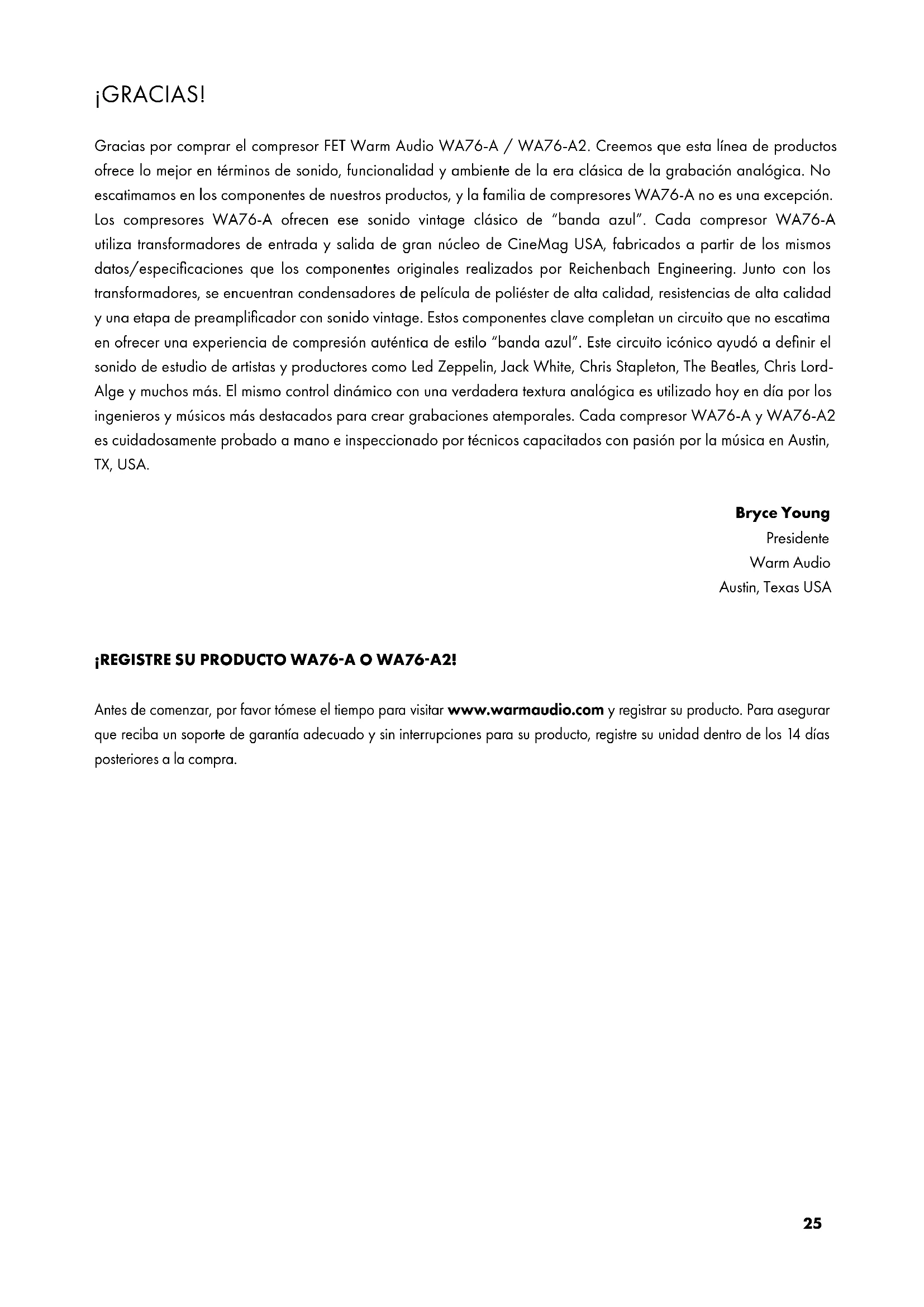 réduire les risques d’électrocution, n’effectuez aucune opération de maintenance autre que celles décrites dans les instructions d’utilisation, à moins d’être qualifié pour le fair.25 ¡GRACIAS! Gracias por comprar el compresor FET Warm Audio WA76-A / WA76-A2. Creemos que esta línea de productos ofrece lo mejor en términos de sonido, funcionalidad y ambiente de la era clásica de la grabación analógica. No escatimamos en los componentes de nuestros productos, y la familia de compresores WA76-A no es una excepción. Los compresores WA76-A ofrecen ese sonido vintage clásico de “banda azul”. Cada compresor WA76-A utiliza transformadores de entrada y salida de gran núcleo de CineMag USA, fabricados a partir de los mismos datos/especificaciones que los componentes originales realizados por Reichenbach Engineering. Junto con los transformadores, se encuentran condensadores de película de poliéster de alta calidad, resistencias de alta calidad y una etapa de preamplificador con sonido vintage. Estos componentes clave completan un circuito que no escatima en ofrecer una experiencia de compresión auténtica de estilo “banda azul”. Este circuito icónico ayudó a definir el sonido de estudio de artistas y productores como Led Zeppelin, Jack White, Chris Stapleton, The Beatles, Chris Lord- Alge y muchos más. El mismo control dinámico con una verdadera textura analógica es utilizado hoy en día por los ingenieros y músicos más destacados para crear grabaciones atemporales. Cada compresor WA76-A y WA76-A2 es cuidadosamente probado a mano e inspeccionado por técnicos capacitados con pasión por la música en Austin, TX, USA. Bryce Young Presidente Warm Audio Austin, Texas USA ¡REGISTRE SU PRODUCTO WA76-A O WA76-A2! Antes de comenzar, por favor tómese el tiempo para visitar www.warmaudio.com y registrar su producto. Para asegurar que reciba un soporte de garantía adecuado y sin interrupciones para su producto, registre su unidad dentro de los 14 días posteriores a la compra.26
