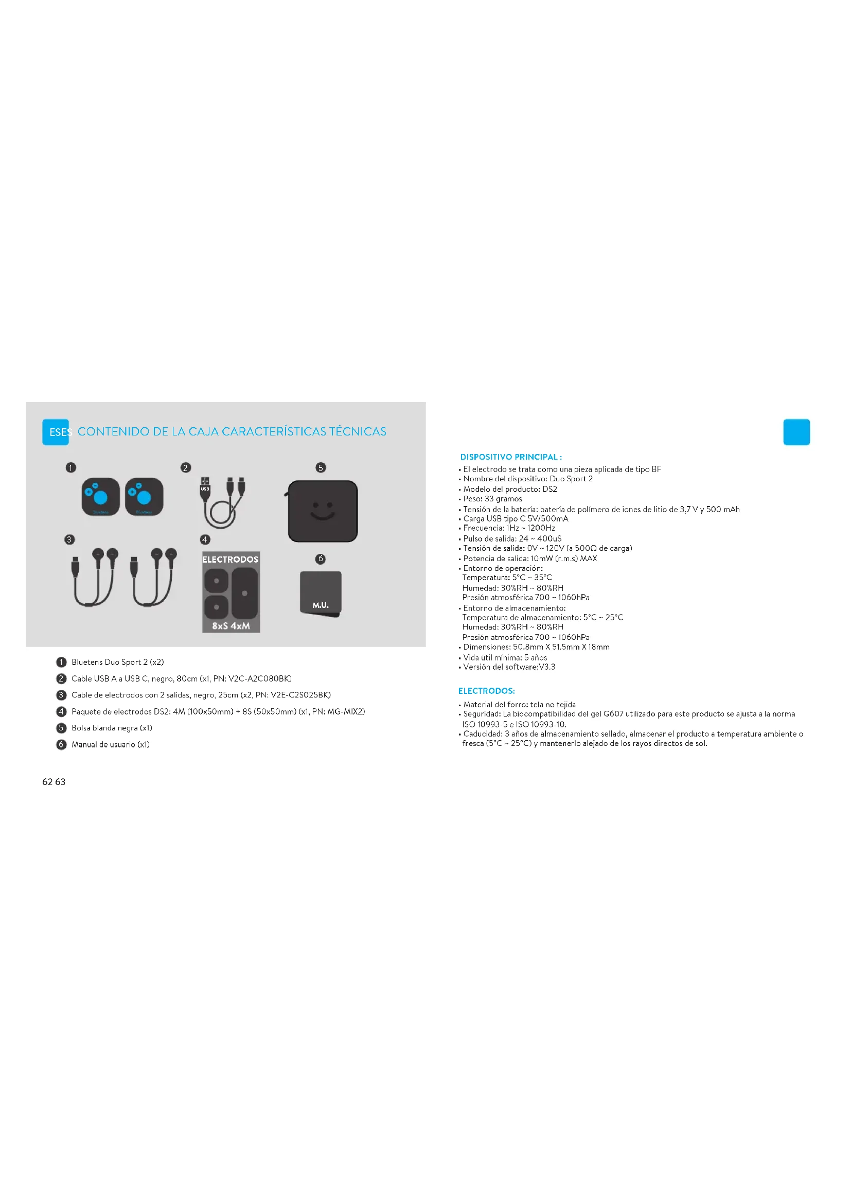 - Caducidad: 3 años de almacenamiento sellado, almacenar el producto a temperatura ambiente o fresca (5°C ~ 25°C) y mantenerlo alejado de los rayos directos de sol. DISPOSITIVO PRINCIPAL : ELECTRODOS: CONTENIDO DE LA CAJA CARACTERÍSTICAS TÉCNICAS