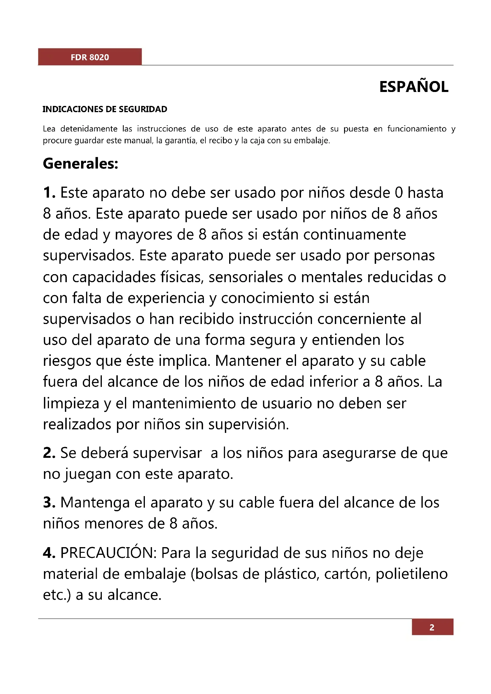 ya que un niño podría tirar del cable y hacer caer la freidora. Después de limpiar la freidora, asegúrese de que todas las piezas están completamente secas. No deje la freidora desatendida mientras está funcionando. No utilice la freidora si tiene algún tipo de daño, ya sea en el cable o en el enchufe. Haga que la revisen o que la reparen: consulte el apartado “reparaciones”. Lleve cuidado con el vapor durante el uso de la freidora y al abrir la tapa. No coloque la freidora cerca de placas de cocción calientes o sobre éstas. La freidora está destinada únicamente al uso doméstico. Los niños deben estar vigilados para evitar que jueguen con la freidora. No sumerja la freidora en agua para limpiarla. No utilice la freidora en el exterior. Siempre desenchufe la freidora después de utilizarla. Algunas superficies exteriores de la unidad se calentarán. Tenga cuidado cuando toque estas zonas para evitar lesiones. Este aparato está previsto para su utilización como aparato de uso doméstico y análogo como pequeñas áreasFDR 8020