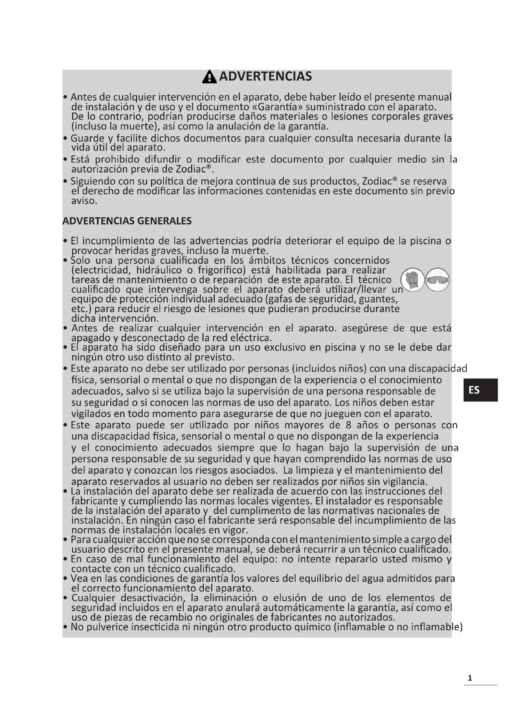 - Siguiendo con su políca de mejora connua de sus productos, Zodiac® se reserva el derecho de modicar las informaciones contenidas en este documento sin previo aviso. ADVERTENCIAS GENERALES