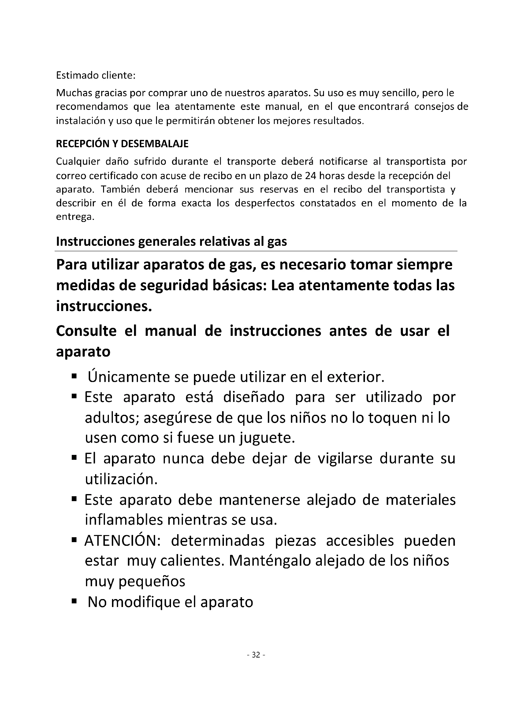 Cualquier daño sufrido durante el transporte deberá notificarse al transportista por correo certificado con acuse de recibo en un plazo de 24 horas desde la recepción del aparato. También deberá mencionar sus reservas en el recibo del transportista y describir en él de forma exacta los desperfectos constatados en el momento de la entrega. Instrucciones generales relativas al gas Para utilizar aparatos de gas, es necesario tomar siempre medidas de seguridad básicas: Lea atentamente todas las instrucciones. Consulte el manual de instrucciones antes de usar el aparato