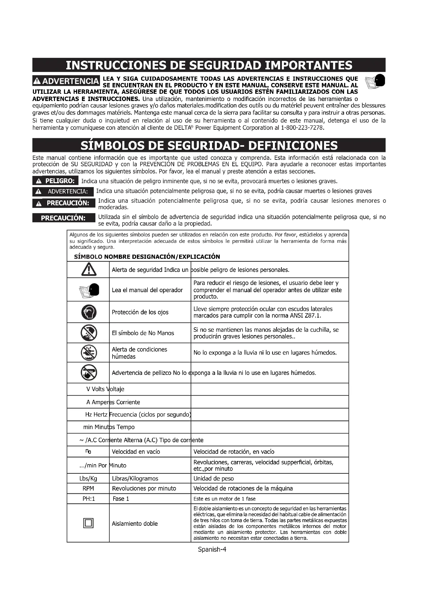 LEA Y SIGA CUIDADOSAMENTE TODAS LAS ADVERTENCIAS E INSTRUCCIONES QUE SE ENCUENTRAN EN EL PRODUCTO Y EN ESTE MANUAL. CONSERVE ESTE MANUAL. AL UTILIZAR LA HERRAMIENTA, ASEGÚRESE DE QUE TODOS LOS USUARIOS ESTÉN FAMILIARIZADOS CON LAS ADVERTENCIAS E INSTRUCCIONES. Una utilización, mantenimiento o modicación incorrectos de las herramientas o equipamiento podrían causar lesiones graves y/o daños materiales.modication des outils ou du matériel peuvent entraîner des blessures graves et/ou des dommages matériels. Mantenga este manual cerca de la sierra para facilitar su consulta y para instruir a otras personas. Si tiene cualquier duda o inquietud en relación al uso de su herramienta o al contenido de este manual, detenga el uso de la herramienta y comuníquese con atención al cliente de DELTA