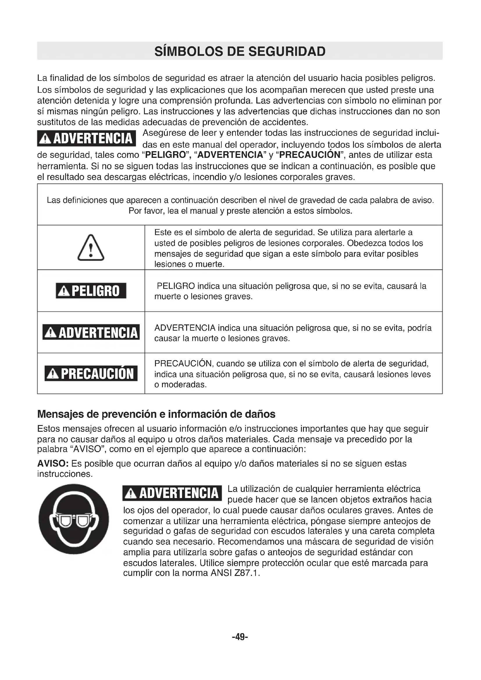 La nalidad de los símbolos de seguridad es atraer la atención del usuario hacia posibles peligros. Los símbolos de seguridad y las explicaciones que los acompañan merecen que usted preste una atención detenida y logre una comprensión profunda. Las advertencias con símbolo no eliminan por sí mismas ningún peligro. Las instrucciones y las advertencias que dichas instrucciones dan no son sustitutos de las medidas adecuadas de prevención de accidentes. ADVERTENCIA Asegúrese de leer y entender todas las instrucciones de seguridad inclui- das en este manual del operador, incluyendo todos los símbolos de alerta de seguridad, tales como “PELIGRO”, “ADVERTENCIA” y “PRECAUCIÓN”, antes de utilizar esta herramienta. Si no se siguen todas las instrucciones que se indican a continuación, es posible que el resultado sea descargas eléctricas, incendio y/o lesiones corporales graves. Las deniciones que aparecen a continuación describen el nivel de gravedad de cada palabra de aviso. Por favor, lea el manual y preste atención a estos símbolos.Este es el símbolo de alerta de seguridad. Se utiliza para alertarle a usted de posibles peligros de lesiones corporales. Obedezca todos los mensajes de seguridad que sigan a este símbolo para evitar posibles lesiones o muerte. PELIGRO PELIGRO indica una situación peligrosa que, si no se evita, causará la muerte o lesiones graves. ADVERTENCIA ADVERTENCIA indica una situación peligrosa que, si no se evita, podría causar la muerte o lesiones graves. PRECAUCIÓN PRECAUCIÓN, cuando se utiliza con el símbolo de alerta de seguridad, indica una situación peligrosa que, si no se evita, causará lesiones leves o moderadas. Mensajes de prevención e información de daños Estos mensajes ofrecen al usuario información e/o instrucciones importantes que hay que seguir para no causar daños al equipo u otros daños materiales. Cada mensaje va precedido por la palabra “AVISO”, como en el ejemplo que aparece a continuación: AVISO: Es posible que ocurran daños al equipo y/o daños materiales si no se siguen estas instrucciones. ADVERTENCIA La utilización de cualquier herramienta eléctrica puede hacer que se lancen objetos extraños hacia los ojos del operador, lo cual puede causar daños oculares graves. Antes de comenzar a utilizar una herramienta eléctrica, póngase siempre anteojos de seguridad o gafas de seguridad con escudos laterales y una careta completa cuando sea necesario. Recomendamos una máscara de seguridad de visión amplia para utilizarla sobre gafas o anteojos de seguridad estándar con escudos laterales. Utilice siempre protección ocular que esté marcada para cumplir con la norma ANSI Z87.1.-50-