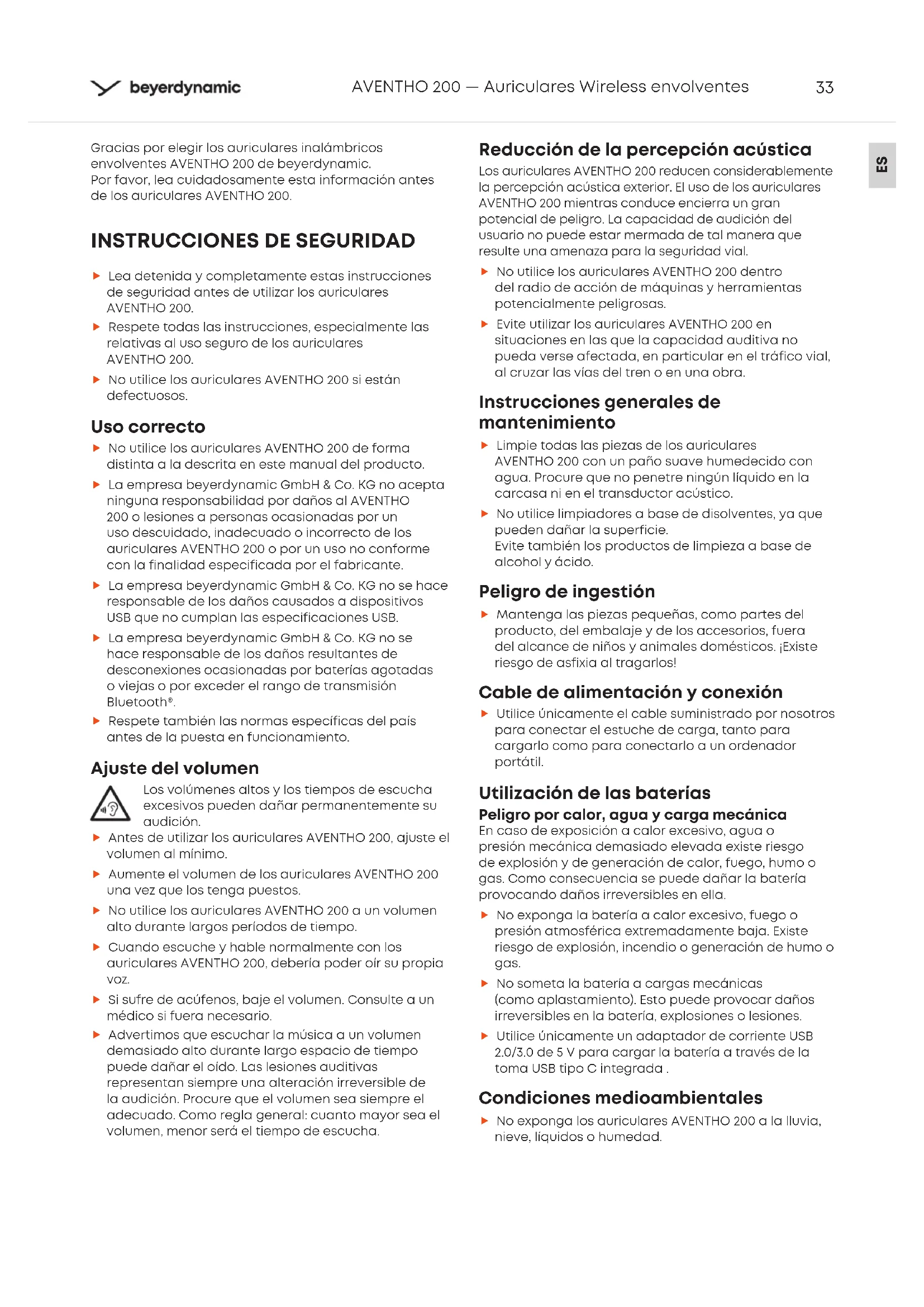 Lea detenida y completamente eas inrucciones de seguridad antes de utilizar los auriculares AVENTHO 200. Respete todas las inrucciones, especialmente las relativas al uso seguro de los auriculares AVENTHO 200. No utilice los auriculares AVENTHO 200 si eán defectuosos. Uso correcto No utilice los auriculares AVENTHO 200 de forma diinta a la descrita en ee manual del producto. La empresa beyerdynamic GmbH & Co. KG no acepta ninguna responsabilidad por daños al AVENTHO 200 o lesiones a personas ocasionadas por un uso descuidado, inadecuado o incorrecto de los auriculares AVENTHO 200 o por un uso no conforme con la finalidad especificada por el fabricante. La empresa beyerdynamic GmbH & Co. KG no se hace responsable de los daños causados a dispositivos USB que no cumplan las especificaciones USB. La empresa beyerdynamic GmbH & Co. KG no se hace responsable de los daños resultantes de desconexiones ocasionadas por baterías agotadas o viejas o por exceder el rango de transmisión Bluetooth®. Respete también las normas específicas del país antes de la puea en funcionamiento. Ajue del volumen Los volúmenes altos y los tiempos de escucha excesivos pueden dañar permanentemente su audición. Antes de utilizar los auriculares AVENTHO 200, ajue el volumen al mínimo. Aumente el volumen de los auriculares AVENTHO 200 una vez que los tenga pueos. No utilice los auriculares AVENTHO 200 a un volumen alto durante largos períodos de tiempo. Cuando escuche y hable normalmente con los auriculares AVENTHO 200, debería poder oír su propia voz. Si sufre de acúfenos, baje el volumen. Consulte a un médico si fuera necesario. Adveimos que escuchar la música a un volumen demasiado alto durante largo espacio de tiempo puede dañar el oído. Las lesiones auditivas representan siempre una alteración irreversible de la audición. Procure que el volumen sea siempre el adecuado. Como regla general: cuanto mayor sea el volumen, menor será el tiempo de escucha. Reducción de la percepción acúica Los auriculares AVENTHO 200 reducen considerablemente la percepción acúica exterior. El uso de los auriculares AVENTHO 200 mientras conduce encierra un gran potencial de peligro. La capacidad de audición del usuario no puede ear mermada de tal manera que resulte una amenaza para la seguridad vial. No utilice los auriculares AVENTHO 200 dentro del radio de acción de máquinas y herramientas potencialmente peligrosas. Evite utilizar los auriculares AVENTHO 200 en situaciones en las que la capacidad auditiva no pueda verse afectada, en paicular en el tráfico vial, al cruzar las vías del tren o en una obra. Inrucciones generales de mantenimiento Limpie todas las piezas de los auriculares AVENTHO 200 con un paño suave humedecido con agua. Procure que no penetre ningún líquido en la carcasa ni en el transductor acúico. No utilice limpiadores a base de disolventes, ya que pueden dañar la supeicie. Evite también los productos de limpieza a base de alcohol y ácido. Peligro de ingeión Mantenga las piezas pequeñas, como paes del producto, del embalaje y de los accesorios, fuera del alcance de niños y animales doméicos. ¡Exie riesgo de asfixia al tragarlos! Cable de alimentación y conexión Utilice únicamente el cable suminirado por nosotros para conectar el euche de carga, tanto para cargarlo como para conectarlo a un ordenador poátil. Utilización de las baterías Peligro por calor, agua y carga mecánica En caso de exposición a calor excesivo, agua o presión mecánica demasiado elevada exie riesgo de explosión y de generación de calor, fuego, humo o gas. Como consecuencia se puede dañar la batería provocando daños irreversibles en ella. No exponga la batería a calor excesivo, fuego o presión atmosférica extremadamente baja. Exie riesgo de explosión, incendio o generación de humo o gas. No someta la batería a cargas mecánicas (como aplaamiento). Eo puede provocar daños irreversibles en la batería, explosiones o lesiones. Utilice únicamente un adaptador de corriente USB 2.0/3.0 de 5 V para cargar la batería a través de la toma USB tipo C integrada . Condiciones medioambientales No exponga los auriculares AVENTHO 200 a la lluvia, nieve, líquidos o humedad.34