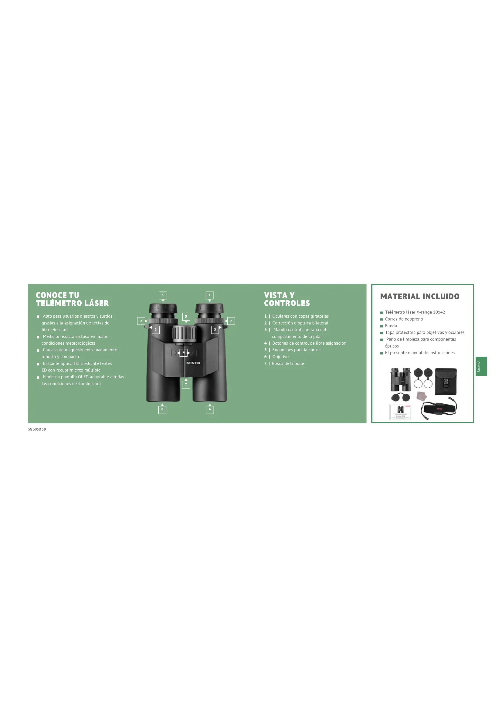 Apto para usuarios diestros y zurdos gracias a la asignación de teclas de libre elección Medición exacta incluso en malas condiciones meteorológicas Carcasa de magnesio extremadamente robusta y compacta Brillante óptica HD mediante lentes ED con recubrimiento múltiple Moderna pantalla OLED adaptable a todas las condiciones de iluminación VISTA Y CONTROLES 1 | Oculares con copas giratorias 2 | Corrección dióptrica bilateral 3 | Mando central con tapa del compartimento de la pila 4 | Botones de control de libre asignación 5 | Enganches para la correa 6 | Objetivo 7 | Rosca de trípode MATERIAL INCLUIDO Telémetro láser X-range 10x42 Correa de neopreno Funda Tapa protectora para objetivos y oculares Paño de limpieza para componentes ópticos El presente manual de instrucciones60 6160 61 Español EXPLICACIÓN DE LOS SIGNOS E INDICACIONES DE SEGURIDAD El presente manual de instrucciones pertenece al telémetro láser MINOX X-range 10x42 (en lo sucesivo solo «X-range» o «prismáticos»). Es parte integrante del producto e incluye infor- mación importante sobre su puesta en marcha, manejo y elimi- nación. Te rogamos que leas detenidamente el manual de ins- trucciones, especialmente las indicaciones de seguridad, antes de utilizar los prismáticos. El incumplimiento de lo dispuesto en el presente manual de instrucciones puede provocar daños en los prismáticos. El manual de instrucciones toma como base las normas y reglas vigentes en la Unión Europea. Cuando estés en el extranjero, ten en cuenta también las directrices y leyes específicas de cada país. Guarda el manual de instrucciones por si lo necesitas en el futuro. Si le entregas tus prismáticos X-ran- ge a alguien, asegúrate de incluir este manual de instrucciones. Utiliza los prismáticos solo como se describe en el presente manual de instrucciones. Cualquier otro tipo de uso se conside- ra inadecuado y puede provocar daños materiales. El fabricante o el distribuidor no asumen ningún tipo de responsabilidad por daños provocados por un uso inadecuado o incorrecto o por modificaciones no autorizadas. Hemos hecho todo lo necesario para redactar este manual de instrucciones de la forma más completa y precisa posible. No obstante, no se puede garantizar que no se haya producido al- gún error u omisión durante el proceso de impresión. Los accesorios que has recibido pueden diferir ligeramente de los mencionados. Este paquete se puede modificar sin previo aviso. En el presente manual de instrucciones, en el aparato o en su embalaje, se utilizan los siguientes símbolos y términos indi- cativos. ¡PELIGRO! Este símbolo/término indicativo indica un peligro de alto nivel de riesgo que, si no se evita, provoca la muerte o le- siones graves. ¡CUIDADO! Este término indicativo advierte sobre posibles daños ma- teriales. No mires NUNCA directamente al sol con tus pris- máticos ni a las fuentes láser. Puede provocar da- ños irreparables en los ojos. Procura mantener tus prismáticos fuera del alcan- ce de los niños. En este caso, existe peligro por in- gestión de piezas pequeñas y por estrangulación con la correa. No toques las superficies metálicas cuando los prismáticos estén muy calientes o muy fríos. Coloca siempre las tapas protectoras cuando aca- bes de utilizarlos. De este modo se protegen las lentes de posibles daños y se excluye el peligro de incendio por focalización de la luz solar con tus prismáticos. Indicaciones adicionales de seguridad relativas al láser y a las pilas Este producto utiliza un rayo láser invisible. Ten en cuenta lo siguiente: No apuntes a los ojos con el láser. No apuntes a la gente con el láser. No mires al láser con instrumentos ópticos. Cuando no estés midiendo, retira el dedo del botón de medi- ción. Así evitarás la activación involuntaria del láser. NO desmontes, modifiques ni repares los prismáticos. El láser puede ser peligroso para tu salud. ADVERTENCIA Este producto ha sido probado y cumple las siguientes normas: PRODUCTO LÁSER DE CLASE 1. RADIACIÓN LÁSER INVISIBLE. NO MIRES NUNCA AL LÁSER CON INSTRUMENTOS ÓPTICOS (PRISMÁTICOS, TELESCOPIO). Este dispositivo cumple las disposiciones de la clase de láser 1 de las normas vigentes IEC 60825-1:2007 2.ª edición (TÜV SÜD), EN 60825-1:2007 y CE conforme a lo dispuesto en EN 61326-1:2013. Este producto cumple las disposiciones de la FDA 21 CFR 1040.10 y 1040.11 y cumple los criterios de la normativa de rendimiento FDA y las normas y reglamentos FCC apartado 15 B:2018 con el método de ensayo ANSI C63.4-2014. El funcionamiento del dispositivo está sujeto a las siguientes restricciones: (1) el dispositivo no puede provocar interferencias perjudiciales y (2) este dispositivo debe aceptar la recepción de interferen- cias, incluidas aquellas que puedan provocar un funcionamien- to no deseado. MINOX GmbH, Ziegelstadel 20, 88316 Isny Indicaciones de seguridad de la pila de litio CR2 Al insertar la pila, asegúrate de que la polaridad sea la co- rrecta (+/-). No trates de cargar la pila. No arrojes la pila al fuego ni al agua. No desmontes la pila. Cuando vayas a desechar la pila, ten en cuenta la legislación vigente.62 6362 63 Español