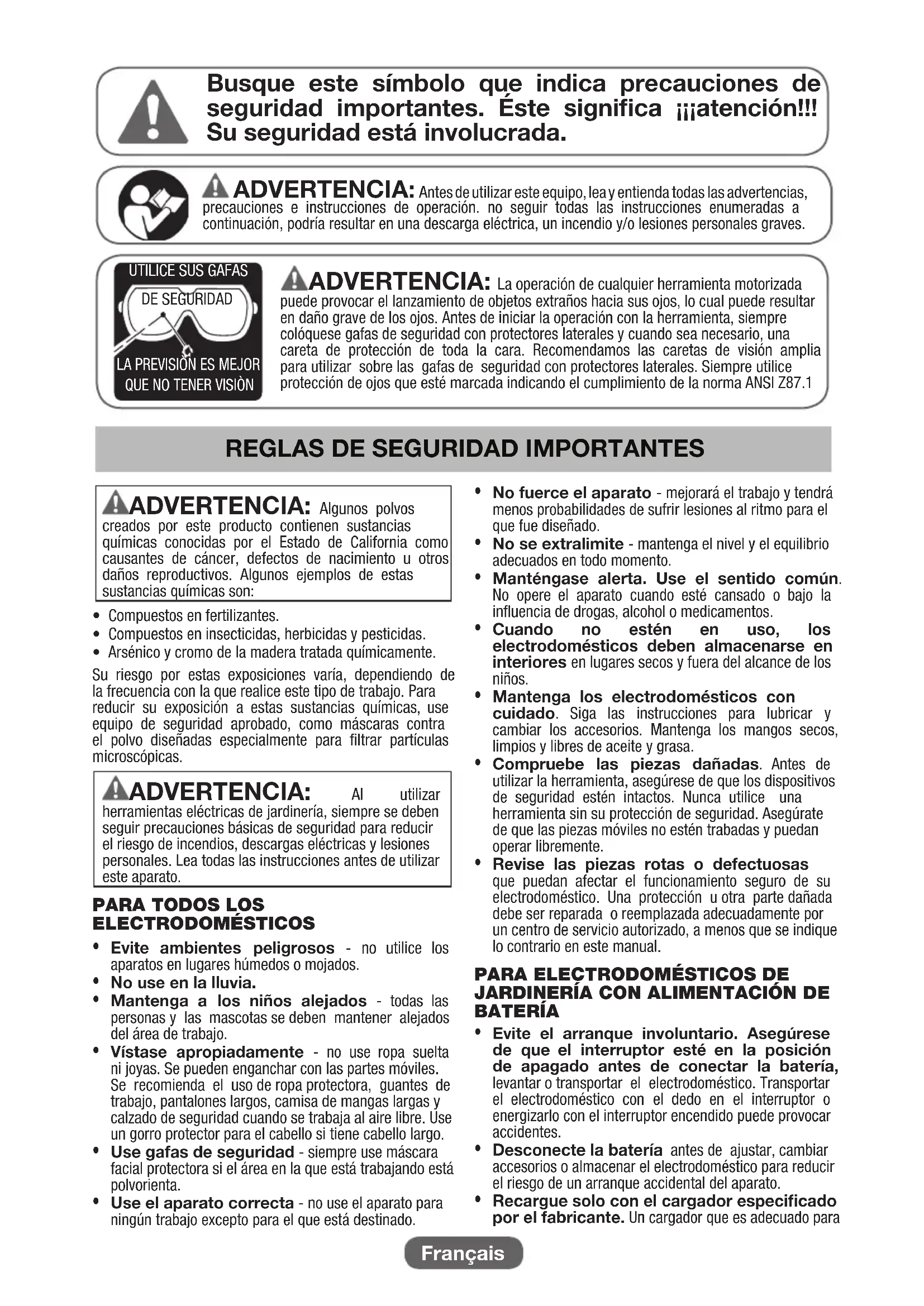 DE SEGURIDAD ADVERTENCIA: La operación de cualquier herramienta motorizada puede provocar el lanzamiento de objetos extraños hacia sus ojos, lo cual puede resultar en daño grave de los ojos. Antes de iniciar la operación con la herramienta, siempre colóquese gafas de seguridad con protectores laterales y cuando sea necesario, una careta de protección de toda la cara. Recomendamos las caretas de visión amplia para utilizar sobre las gafas de seguridad con protectores laterales. Siempre utilice protección de ojos que esté marcada indicando el cumplimiento de la norma ANSI Z87.1 ADVERTENCIA: Antes de utilizar este equipo, lea y entienda todas las advertencias, precauciones e instrucciones de operación. no seguir todas las instrucciones enumeradas a continuación, podría resultar en una descarga eléctrica, un incendio y/o lesiones personales graves.