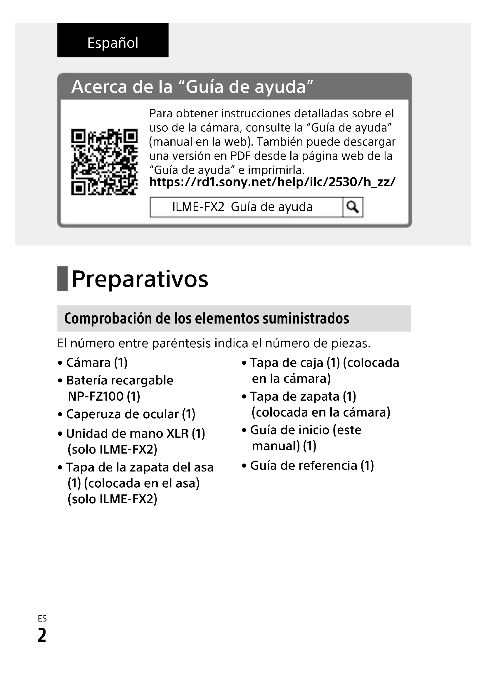 Acerca de la “Guía de ayuda” Para obtener instrucciones detalladas sobre el uso de la cámara, consulte la “Guía de ayuda” (manual en la web). También puede descargar una versión en PDF desde la página web de la “Guía de ayuda” e imprimirla.https://rd1.sony.net/help/ilc/2530/h_zz/ILME-FX2 Guía de ayuda Español Preparativos Comprobación de los elementos suministrados El número entre paréntesis indica el número de piezas.• Cámara (1)• Batería recargable NP-FZ100 (1)• Caperuza de ocular (1) • Unidad de mano XLR (1) (solo ILME-FX2)• Tapa de la zapata del asa (1) (colocada en el asa) (solo ILME-FX2)• Tapa de caja (1) (colocada en la cámara)• Tapa de zapata (1) (colocada en la cámara)• Guía de inicio (este manual) (1)• Guía de referencia (1)ES