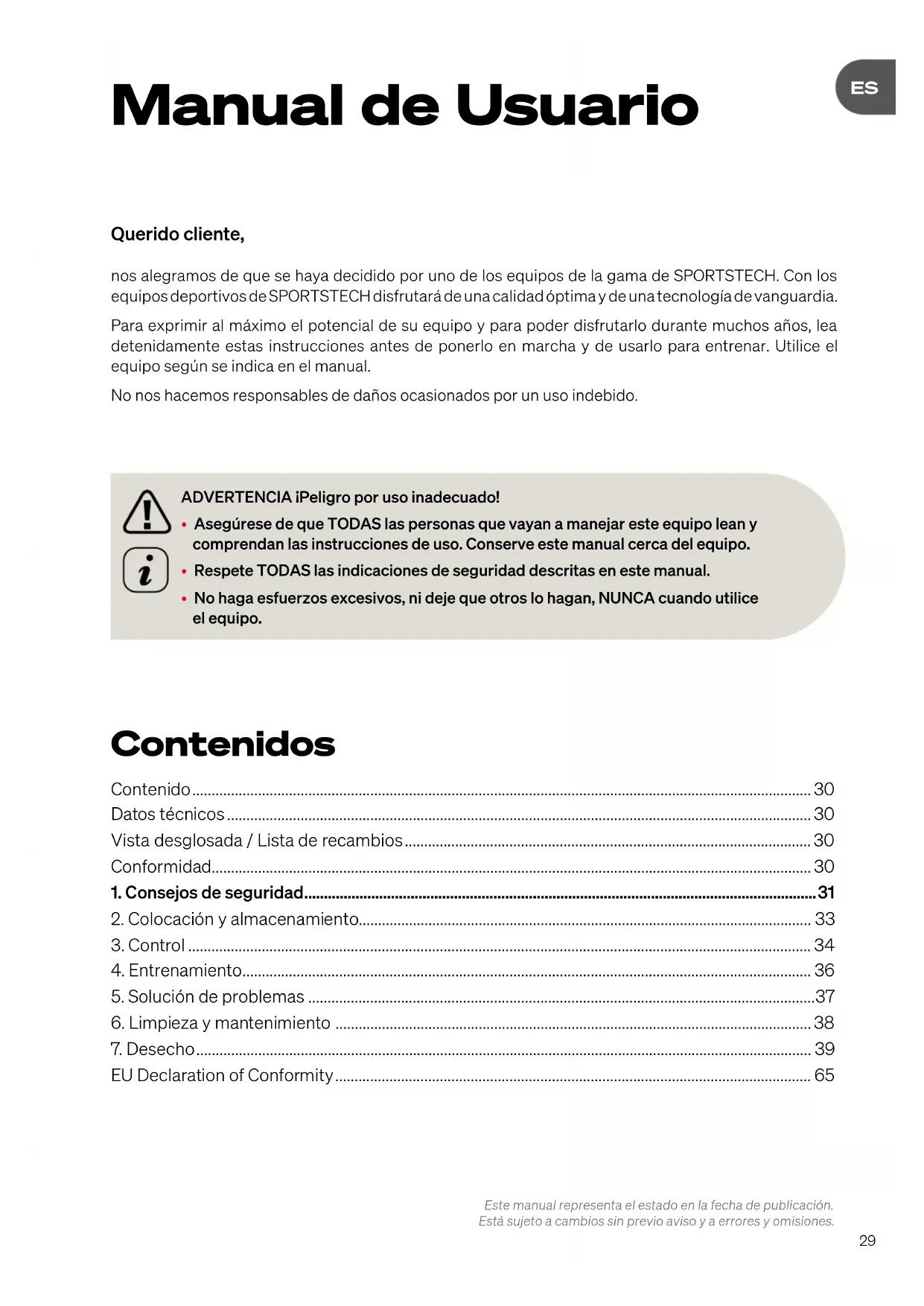 - Manual de Usuario Querido cliente, nos alegramos de que se haya decidido por uno de los equipos de la gama de SPORTSTECH. Con los equipos deportivos de SPORTSTECH disfrutará de una calidad óptima y de una tecnología de vanguardia.Para exprimir al máximo el potencial de su equipo y para poder disfrutarlo durante muchos años, lea detenidamente estas instrucciones antes de ponerlo en marcha y de usarlo para entrenar. Utilice el equipo según se indica en el manual. No nos hacemos responsables de daños ocasionados por un uso indebido.ADVERTENCIA ¡Peligro por uso inadecuado!• Asegúrese de que TODAS las personas que vayan a manejar este equipo lean y comprendan las instrucciones de uso. Conserve este manual cerca del equipo.• Respete TODAS las indicaciones de seguridad descritas en este manual.• No haga esfuerzos excesivos, ni deje que otros lo hagan, NUNCA cuando utilice el equipo.Este manual representa el estado en la fecha de publicación. Está sujeto a cambios sin previo aviso y a errores y omisiones. Contenidos Contenido p. 30